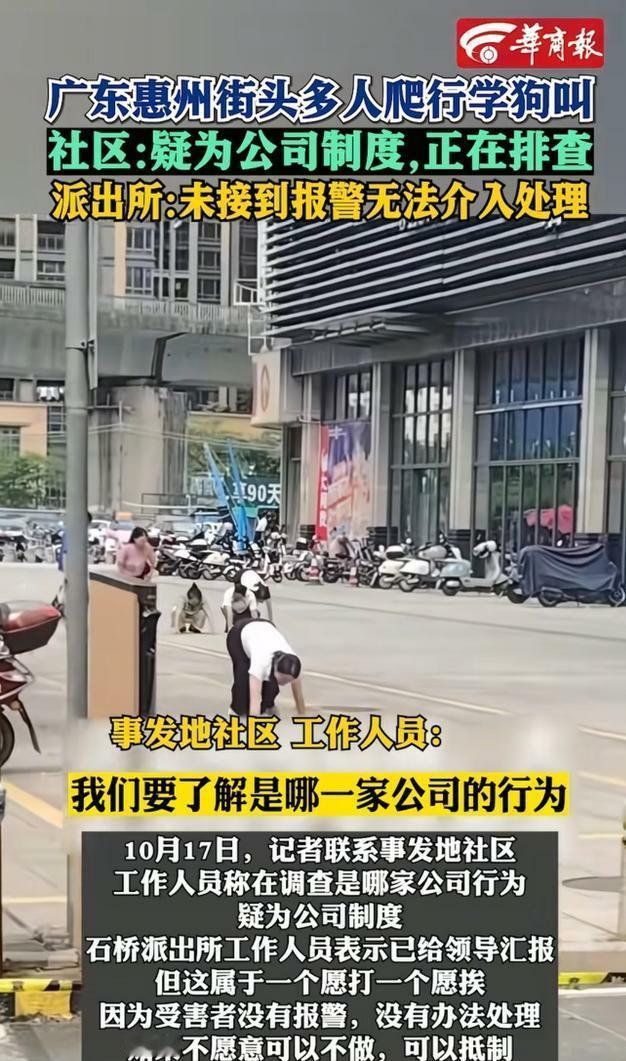 惠州街头多人爬行学狗叫后续:公司身份引疑,社区回应引争议 10月16日,广东
