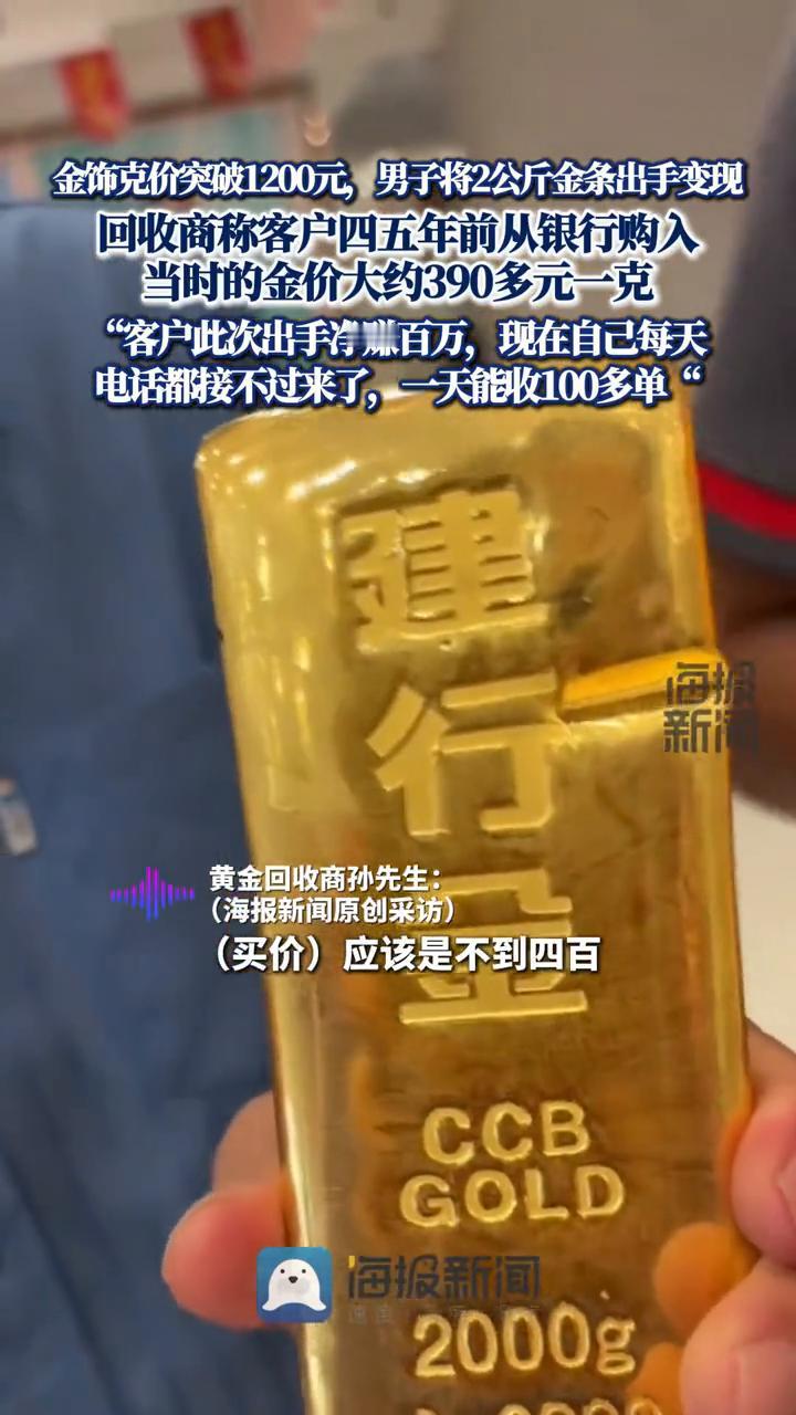 金饰克价突破1200元,男子将2公斤金条出手变现。回收商称客户四五年前从银行购入,当时的金价大约390多元一克。客户此次出手净赚百万,现在自己每天电话都接不过来了,一天能收100多单。 10月14日山东烟台。一块(金砖)就两公斤,赚了将近100万。黄金回收商孙先生:(买价)应该是不到四百,三百九十多。看(最近金价)涨了,赚了一百万。感觉拿着老是睡不踏实,就卖掉了。我这电话都接不过来了,(一天)怎么也得接100多单。金价回收行情 投资金条金价 金条行情 足金金饰价格 银行金条价 金饰价