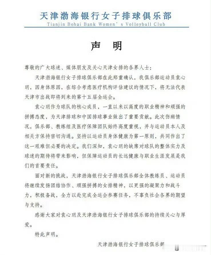 难过[流泪][流泪]袁心玥因为伤病缺席全运会!天津女排昨天晚上发布一条长长的声明:袁心玥因为伤病缺席第十五届全运会啊!天津训练强度得多大啊,这才在天津女排练了几个月,怎么就突然伤了!上一次看袁心玥的比赛,还是去年的土耳其女排联赛啊!还想着袁心玥能参加全运会,再看看中国女排三傻组合袁心玥、龚翔宇、丁霞站在一起拍照呢!丁霞的最后一届全运会了[流泪][流泪]没想到袁心玥也没能参加!