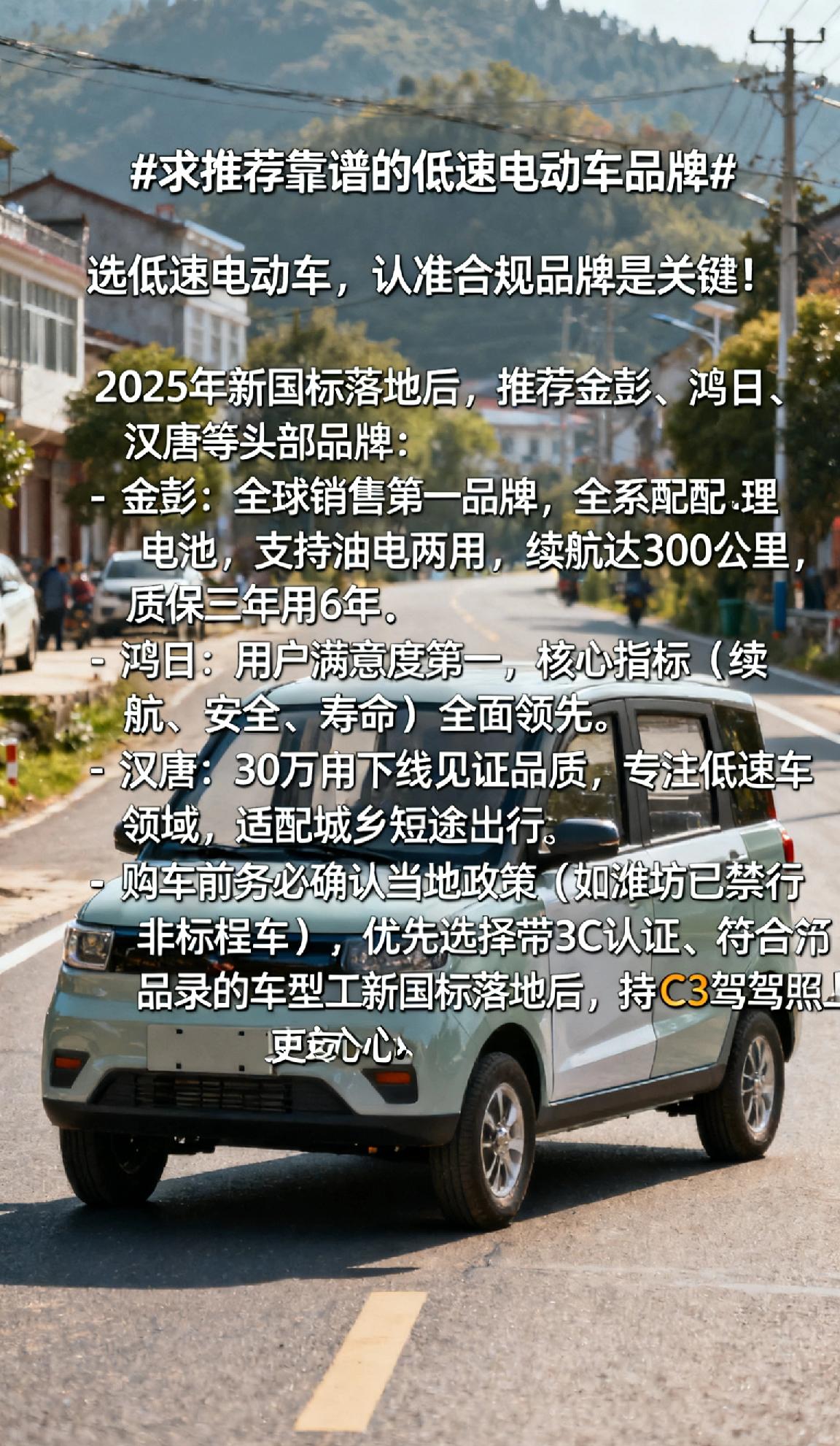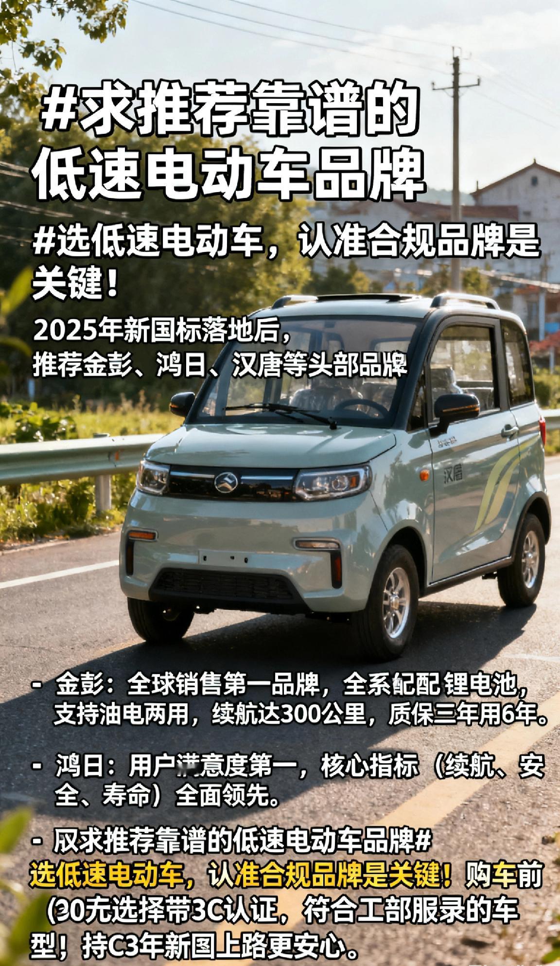选低速电动车,认准合规品牌是关键!2025年新国标落地后,推荐金彭、鸿日、汉唐等头部品牌: - 金彭:全球销量第一品牌,全系标配锂电池,支持油电两用,续航达300公里,质保三年用8年; - 鸿日:用户满意度第一,核心指标(续航、安全、寿命)全面领先; - 汉唐:30万辆下线见证品质,专注低速车领域,适配城乡短途出行。 购车前务必确认当地政策(如潍坊已禁行非标车),优先选择带3C认证、符合工信部目录的车型,持C3驾照上路更安心!四轮低速电动车 代步低速电动车