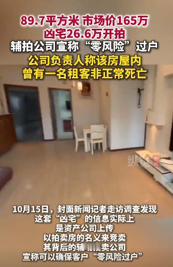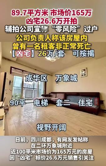 “穷鬼也是鬼!”10月16日成都市成华区万象城,一套价值165万,89平的住宅挂牌26.6万,了解过后才知道,房屋内曾有一名租客非正常死亡,网友:人有多大胆,地有多大产,这可真是捡到宝了![作揖] 成都一套位于黄金地段的低价法拍房在网上吸引了上万次围观,房子在成华区万象城附近,89平的精装电梯房市场价约165万,起拍价却只有26.6万。 司法拍卖页面上一行红色标注格外醒目,该房屋内曾发生租客非正常死亡事件,正是这个凶宅标签,让绝大多数围观者陷入了犹豫。 这套房子具体在双庆路某小区的25楼,位置确实便利,步行到万象城商圈和地铁4号线站点都在十分钟内。 室内装修保持得较新,木地板锃亮,厨房橱柜使用痕迹很少,尽管硬件条件不错,但非正常死亡的具体细节未公开,成了很多人心里过不去的坎。 虽然关注度很高,到10月16日下午已有超过1.2万次围观,664人设置了提醒,但真正报名参拍的只有2人。 事情在网上传开后,围观的网友也纷纷到评论区留言。 “穷鬼的命也是命,但穷鬼的钱包更值得尊重,30万在万象城安家,这漏我都不敢捡,怕晚上邻居是上任租客。” “法拍房加凶宅buff叠满了属于是,别看现在围观的多,真到举牌的时候手都在抖,那5万保证金就是劝退神器。” “说真的改成民宿或者群租可能有人接盘,但坑下一个租客良心不会痛吗,这种钱赚了也不踏实。” “成都房价都这样了,看来是真跌狠了,不过这种房就像榴莲,闻着香啃下去扎嘴消化还难。” “中介说零风险过户,笑死他只管过户,又不管帮你镇宅,住进去天天自己吓自己,省下百万不够看心理医生的。” “我舅爷爷以前就住这种房,价格是便宜,但转手卖了三年没动静,最后打七折才出手,算上利息亏麻了。” “要是买来纯投资不当宿舍我可能敢,但得确保左邻右舍不知道这历史,不然租金都收不上来。” “年轻人或许无所谓,但家里有老人的肯定忌讳,我妈要是知道房里有老住户,连夜扛火车跑路。” “围观12820次报名2人,这数据说明大家都是吃瓜心态,我就看看哪个猛士真上车。” 假如这套房总价再打对折,13万直接拎包入住,你会毫不犹豫拿下?还是给多少钱都不要?评论区说说你的底线! 信息来源:封面新闻2025-10-16