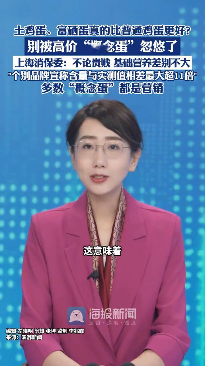 土鸡蛋、富硒蛋真的比普通鸡蛋更好?别被高价"概念蛋"忽悠了。 海报新闻主播潘雯。 上海消保委:不论贵贱基础营养差别不大,"个别品牌宣称含量与实测值相差最大超11倍,多数"概念蛋"都是营销。 无菌蛋、可生食蛋、富硒蛋、DHA蛋、Omega-3蛋,光听名字就"不明觉厉"。花128块钱买30个鸡蛋真的值吗?近日,上海市消保委对30款鸡蛋进行"开蛋实测",结果令人深思。 ·价格从3.7元到50.2元每斤不等的鸡蛋,在基础营养指标上能量、蛋白质、脂肪等并无明显差异。褐壳、白壳、粉壳、绿壳的鸡蛋营养指标也几乎相同。这意味着消费者花50元一斤买的高价蛋,在基础营养上和3元一斤的普通蛋并无二致。 ·在强化营养指标方面,虽然不同样品硒、DHA及Omega-3含量差异明显,但个别高价"营养强化蛋"实测值与宣称值偏差大。消费者购买高价蛋往往是为追求更优营养,但现实却可能并非如此。商家用各种概念包装鸡蛋抬高价格,多数概念蛋都是营销。可食用鸡蛋 鸡蛋四大误区 无菌农家蛋 富硒营养鸡蛋 营养富硒鸡蛋 有机食品鸡蛋 打码富硒鸡蛋