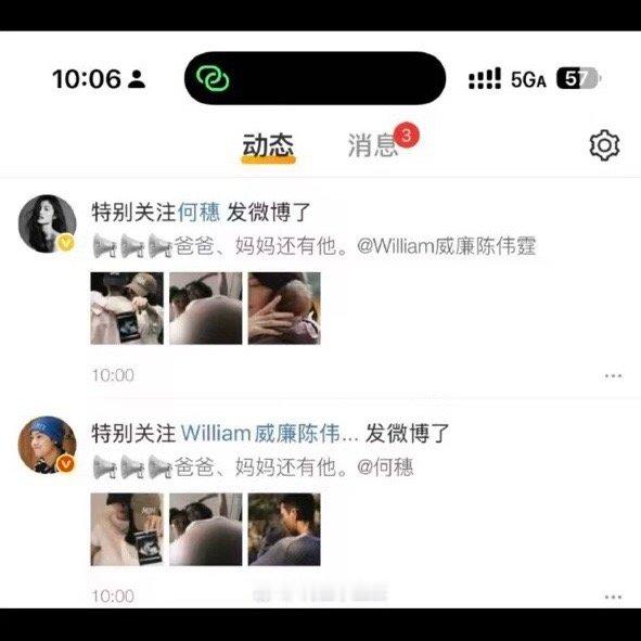陈伟霆何穗同步发的动态里,B超单、孕期相拥照、三只交叠的手的合影,配文就一句“爸爸、妈妈还有他”真的瞬间把人戳得鼻酸。