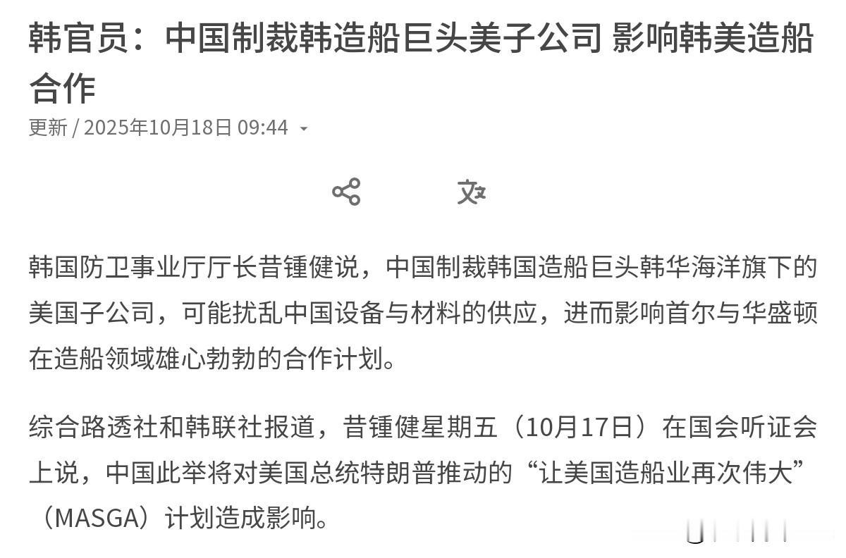 韩国官员不经意之间说出了一个重要情况,韩国明白兹事体大,对中国不敢有抱怨!10月18日,根据外媒报道,在我们制裁韩华海洋旗下的五家美国子公司之后,韩国出来回应了。韩国防卫事业厅厅长昔锺健表示,中国制裁韩国造船巨头韩华海洋旗下的美国子公司,可能扰乱中国设备与材料的供应,进而影响首尔与华盛顿在造船领域雄心勃勃的合作计划。 昔锺健表示,美国造船业及配套产业长期衰退,使得在本土获得足够的零部件和原材料几乎不可能。公司文件显示,韩华海洋在中国山东省设有一家船厂,用于生产船舶模块部件,这些模块被运往韩国船厂进行最终组装。如果必须从韩国向美国运送大量物资,而又受到制裁等各种限制,那最终肯定会对韩美合作的造船计划造成冲击。 很显然,从韩国官员的这一回应来看,其透露出了一个重要的情况,那就是韩华在我们国内有重要投资,且依赖于我们的供应链。因此,我们的制裁令,事实上完全能够打到韩华在美国的子公司。无疑,这个情况就让韩华被夹在了中间。如果韩企不顾我们的制裁令,那其将可能面临我们更严重的制裁,而如果其遵守我们的制裁令,美国的造船计划必然会受到影响。 显然,韩企给美国打击我们的造船业当帮凶,这是将自身置于了非常尴尬的境地。事实上,我们也注意到两个不同寻常的信息,其一是,从韩国的回应来看,韩国官员出来回应的级别较低,这说明韩国不愿意升级与我们的摩擦。其二是,韩国方面陈述了相关情况,但是却语气比较温和。种种迹象显示,韩国政府在中美之间在寻求平衡,尽可能的避免被波及。这当然也显示,韩国并不想选边站队,而依旧重视中韩关系。