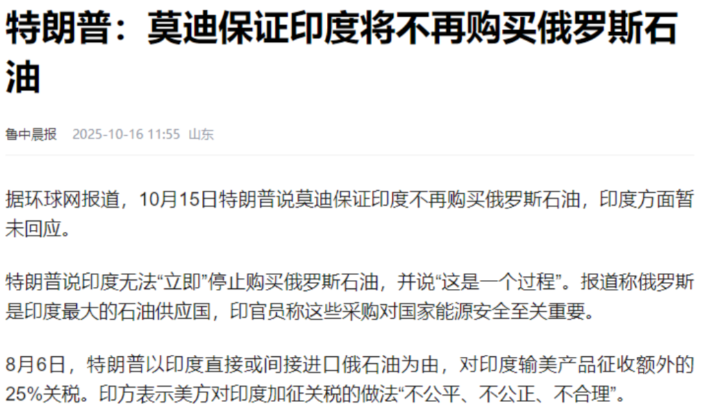 要是真的停止购买俄油,印度国内油价必然大幅上涨,老百姓的生活成本也会跟着水涨船高,这是莫迪政府不得不考虑的现实问题。另一方面,美国又以加征关税相威胁,今年8月,美国就因为印度购买俄油,对印度输美产品加征了50%的关税,导致印度对美出口一个月内暴跌20.7%。在这种情况下,莫迪的“承诺”更像是一种缓兵之计,既能暂时安抚美国,又给自己留了回旋的余地。
