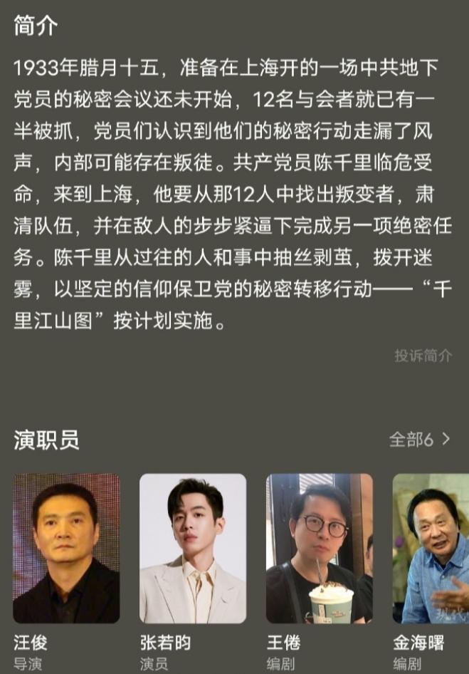 网传《千里江山图》有刘诗诗和关晓彤 这部剧是男频大男主谍战剧,之前官宣过一番大男主是张若昀,导演是《玫瑰的故事》导演汪俊,编剧是《庆余年》编剧王倦,监制是陈道明,谍战剧二番女主,刘诗诗会接吗?杨幂二番接的谍战《哈尔滨一九四四》没啥加成,全是吐槽,所以降低标准接二番作品,也不见得有成效,不过这部剧的制作团队确实更强。