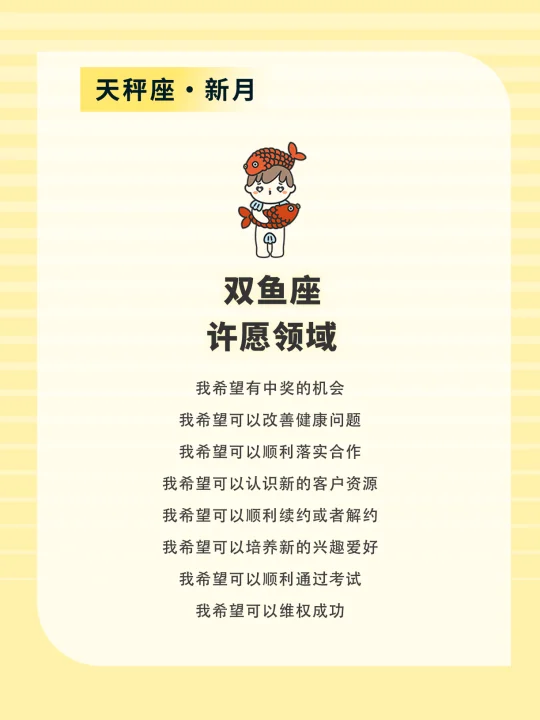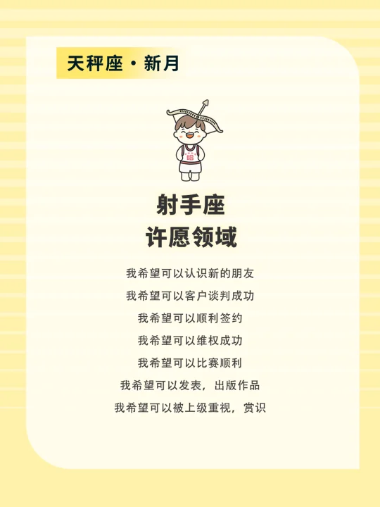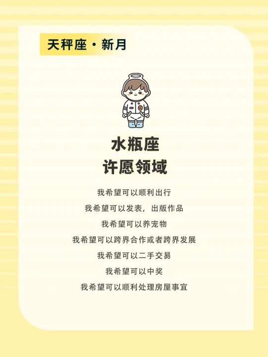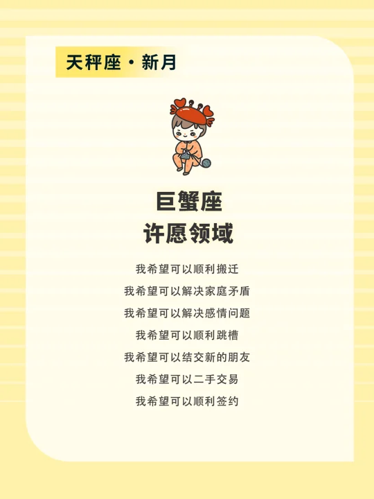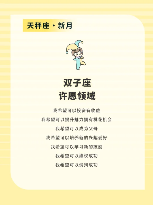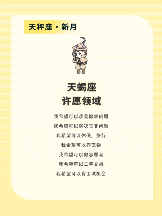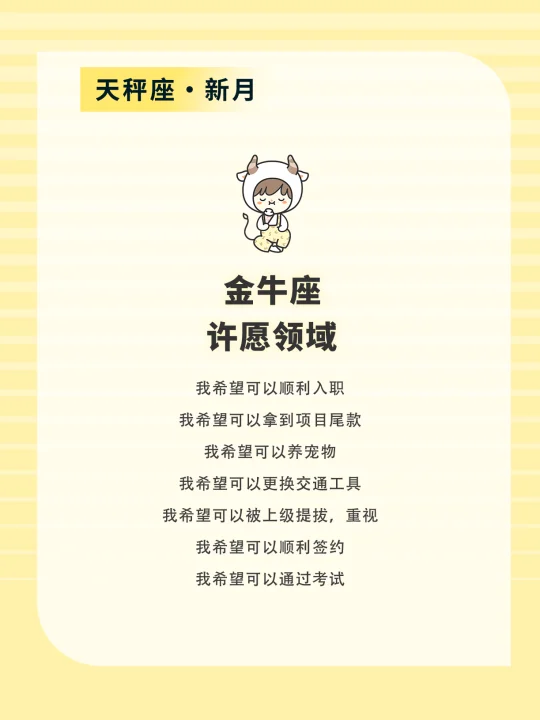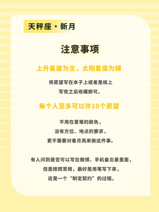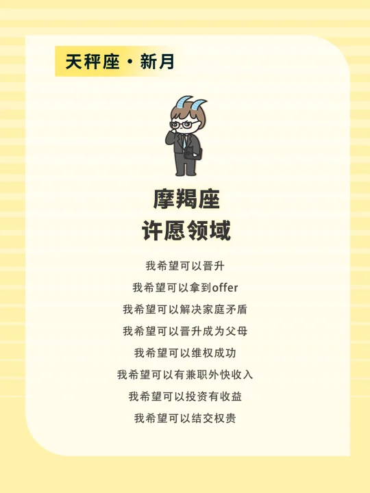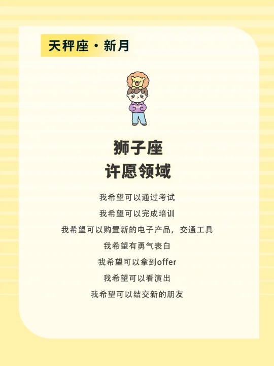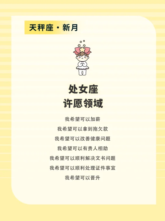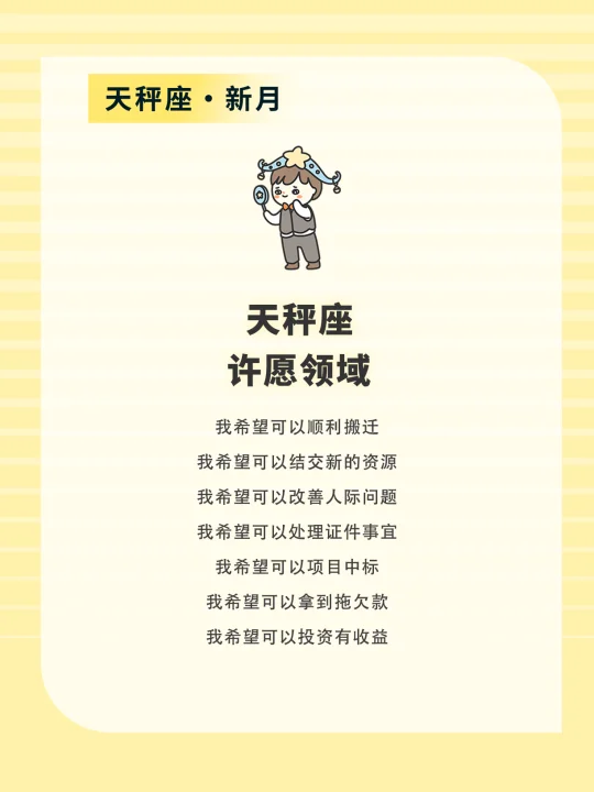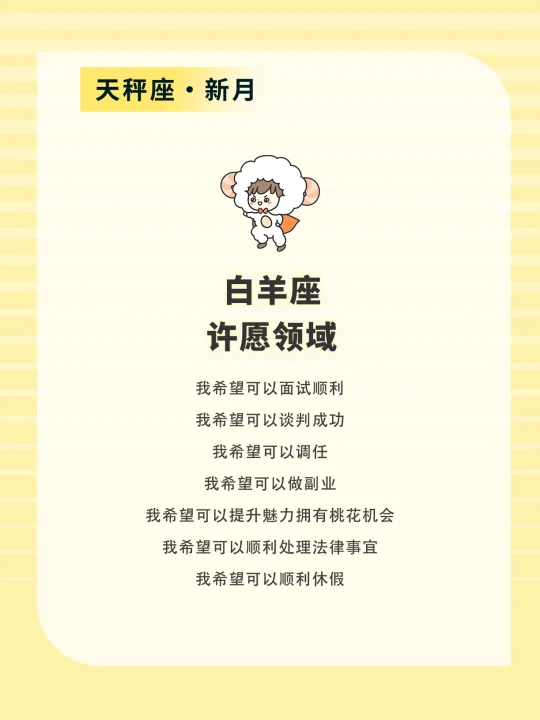 新月开始后,我们一起来许愿吧,这次新月可以让我们取得许多进步和成长。按照下方的提示,选择适合自己的愿望,好好努力。