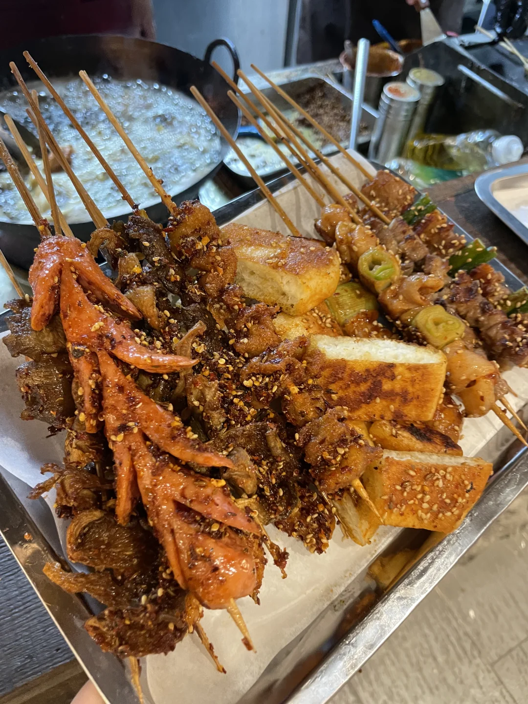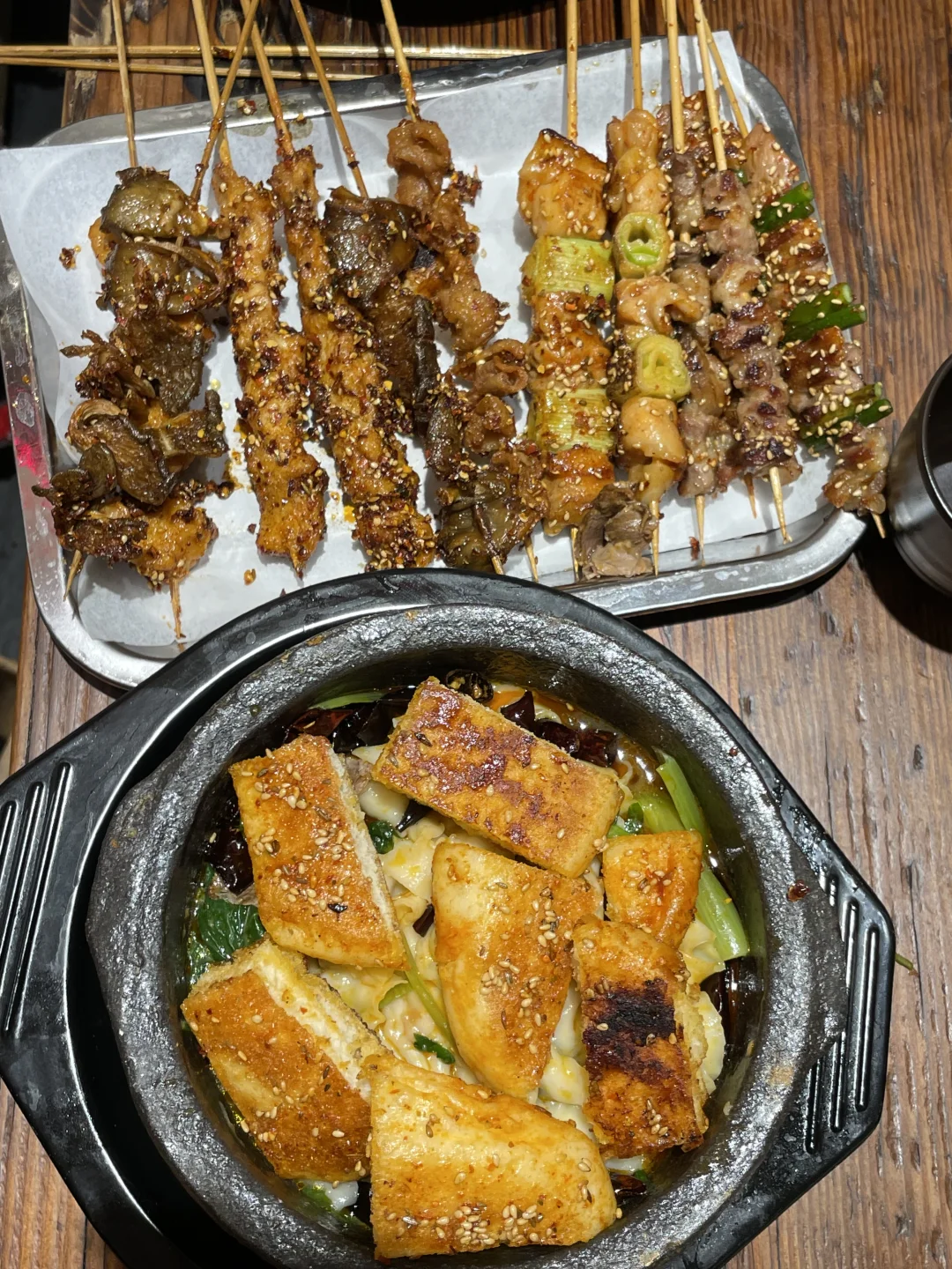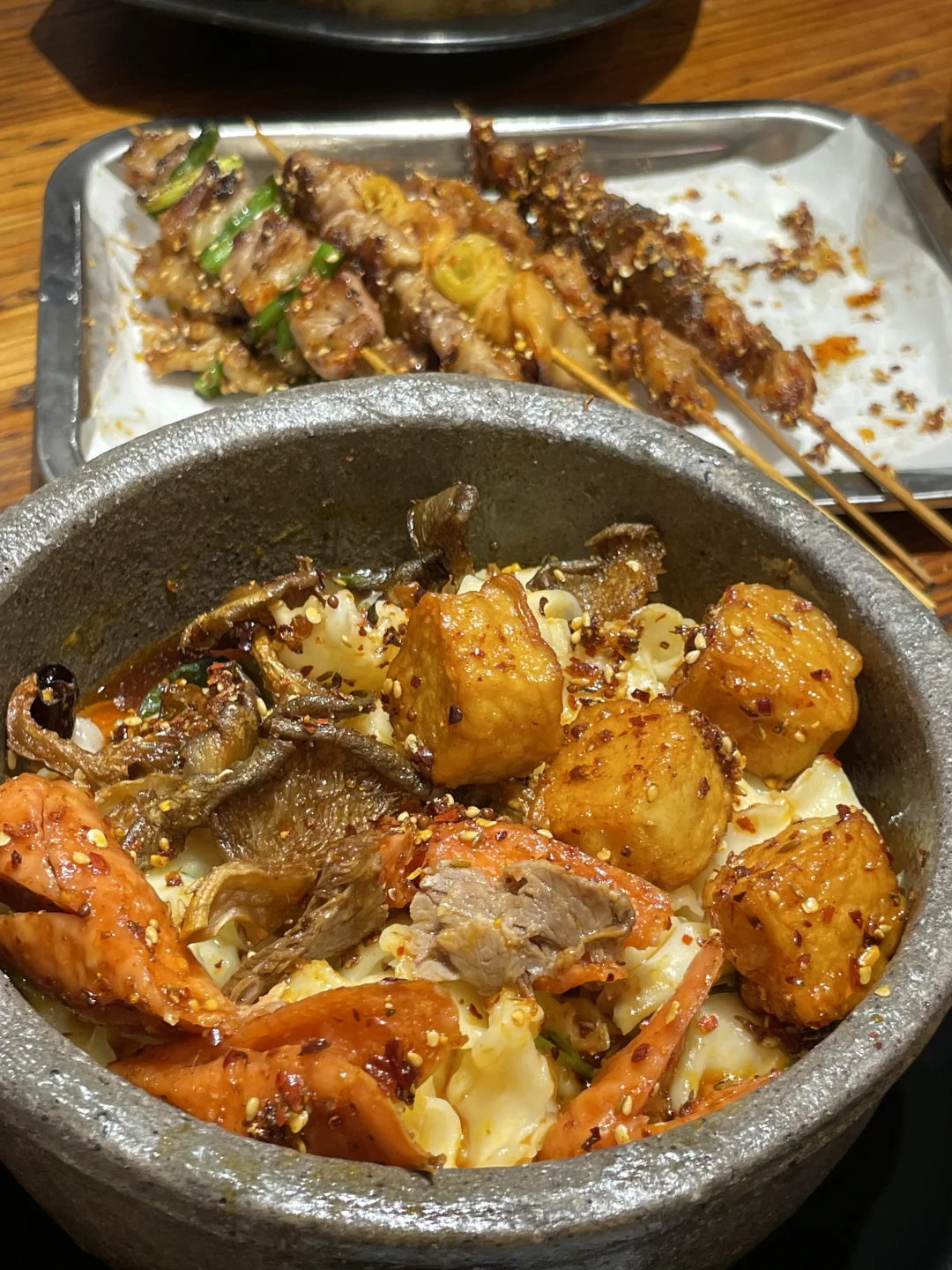 艾玛,排队了,排队了 天凉了就得去吃热乎乎的牛肉刀削面 还有好吃的串串,香辣辣的,过瘾