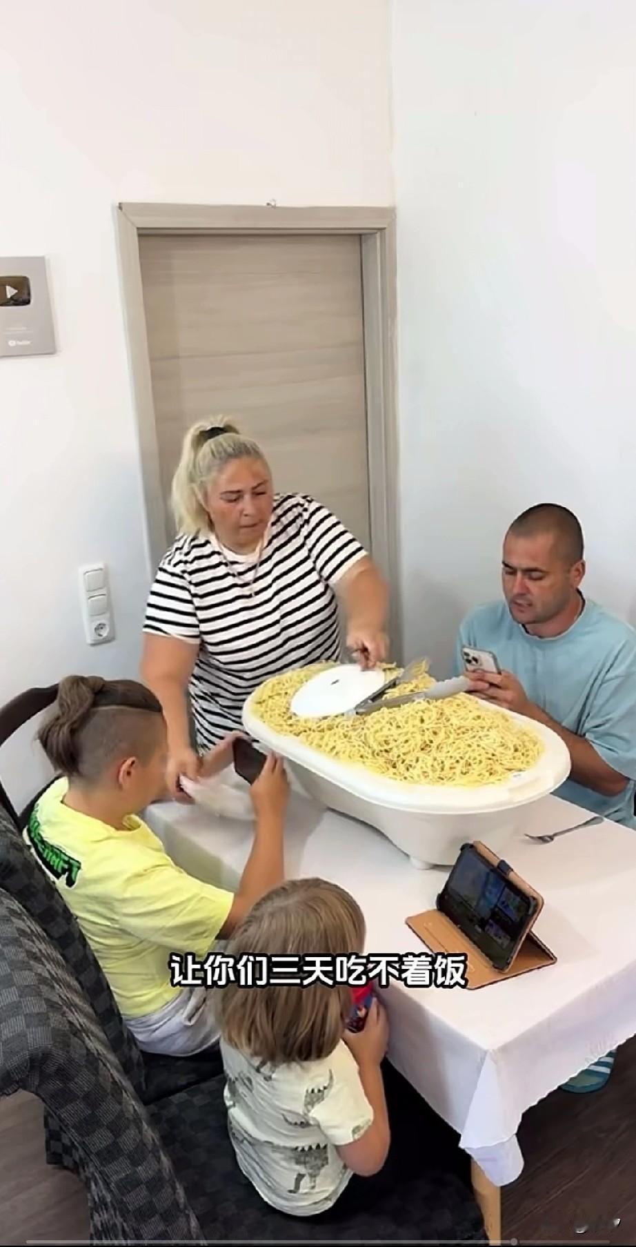 国外一家庭胖妈妈端着一大盆面出来了,她的老公在玩手机, 她的儿子在打游戏, 她的女子在看动漫, 各忙各的都没有理睬女人, 胖妈妈叫了他们几下, 没有人理自己, 于是她自己就就开始先吃了起来, 只见她拿着盘子夹了不少面条, 然后又拿出来番茄酱倒上去, 搅拌后就吃了起来, 等她吃好后又开始叫他们吃饭, 谁知他们太过于沉迷手机, 竟然还是没有理她, 这让胖妈妈生气了, 直接收起盘子抱着整盆面进入了房间, 走的时候还说不吃算了, 饿你们三天看你们吃不吃, 少沉迷手机多运动才是健康之道! 大家觉得对吗? 钟爱异国美食 晚餐分享 胖宝妈减肥 中年胖妈妈 大码妈妈 胖妈妈时尚