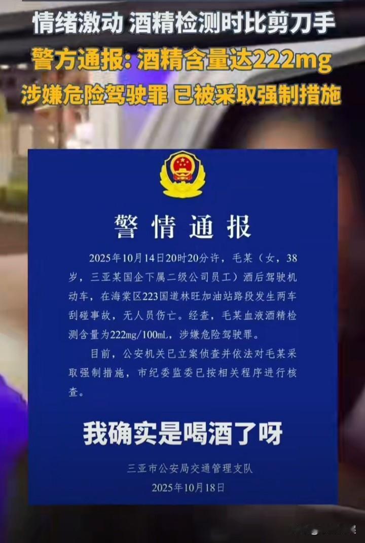 大快人心! 那个撞到劳斯莱斯大喊“我是国企,让市委市政府通报我”的三亚女子,涉嫌危险驾驶罪,已经被采取强制措施了。 前面有多嚣张,现在就有多后悔。在撞到别人车后不仅不道歉,还嚣张的说“我就是喝了酒,我是国企,让市委政府通报我”。 这下好了正如你所愿,市委政府通不通报你我不知道,反正现在你已经是被全网通报了。