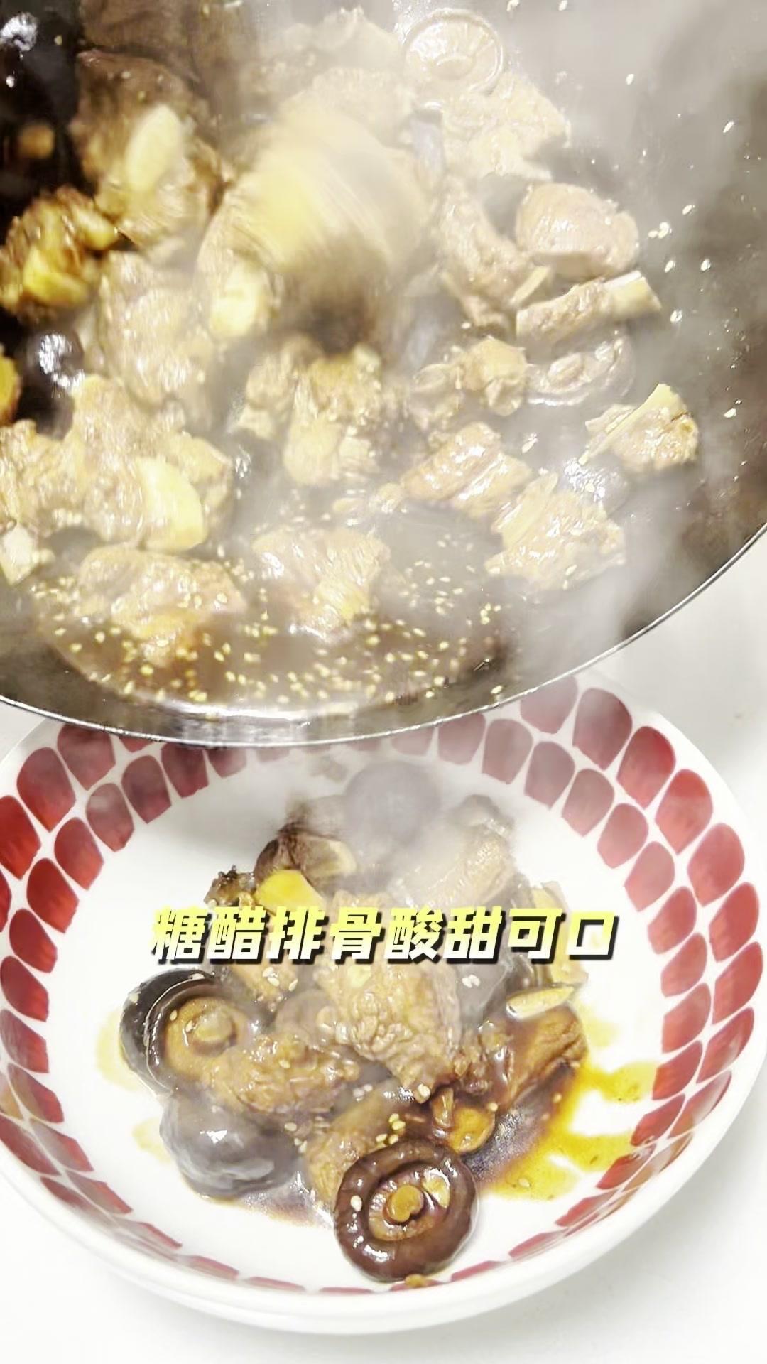 1️⃣排骨处理:让老板切小块,冷水洗干净后撒淀粉搓洗,冲净沥干水分,这样能去血水腥味,还能避免下油锅溅油~ 2️⃣烹饪过程:排骨直接下锅,中小火炒至表面变色,加泡发香菇、料酒、冰糖、蚝油、生抽和一点点老抽,盖锅盖焖40分钟,最后开大火收汁,淋圈锅边醋,撒白芝麻就好啦~ 酸甜入味,肉嫩脱骨,家里小朋友超爱吃的家常菜,赶紧试试吧!