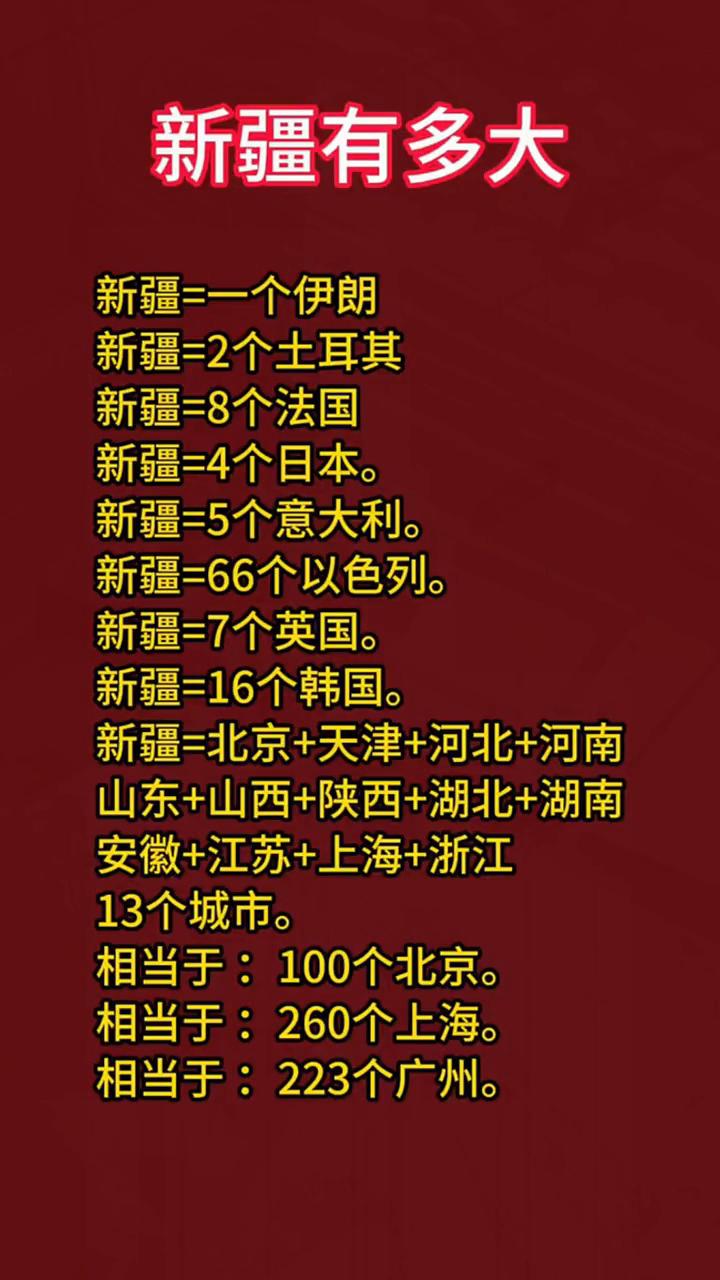 新疆有多大? 新疆=一个伊朗。 新疆=2个土耳其。 新疆=8个法国。 新疆=4个日本。 新疆=5个意大利。 新疆=66个以色列。 新疆=7个英国。 新疆=16个韩国。 新疆=北京+天津+河北+河南。 山东+山西+陕西+湖北+湖南。 安徽+江苏+上海+浙江。 13个城市。 相当于:100个北京。 相当于:260个上海。 相当于:223个广州。