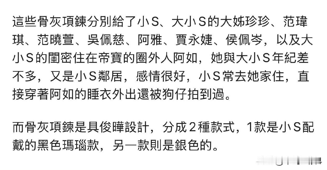 奇葩,也只有S家能做的出来,大S的骨灰做成了多条骨灰项链送给S姐妹团、家人、还有