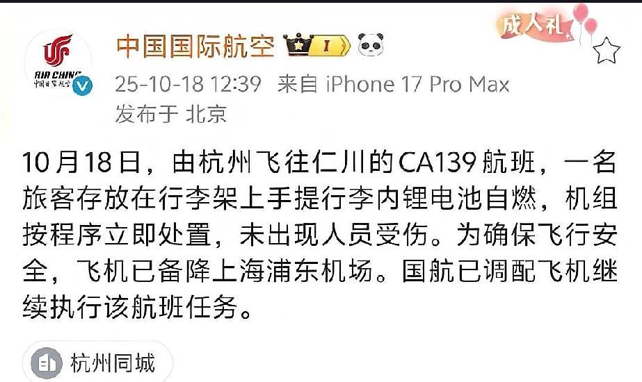 10月18日,国航一航班在飞行途中遭遇行李架起火,引发乘客恐慌。 10月18日,