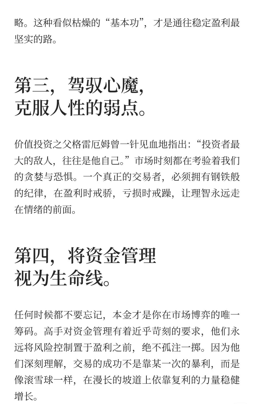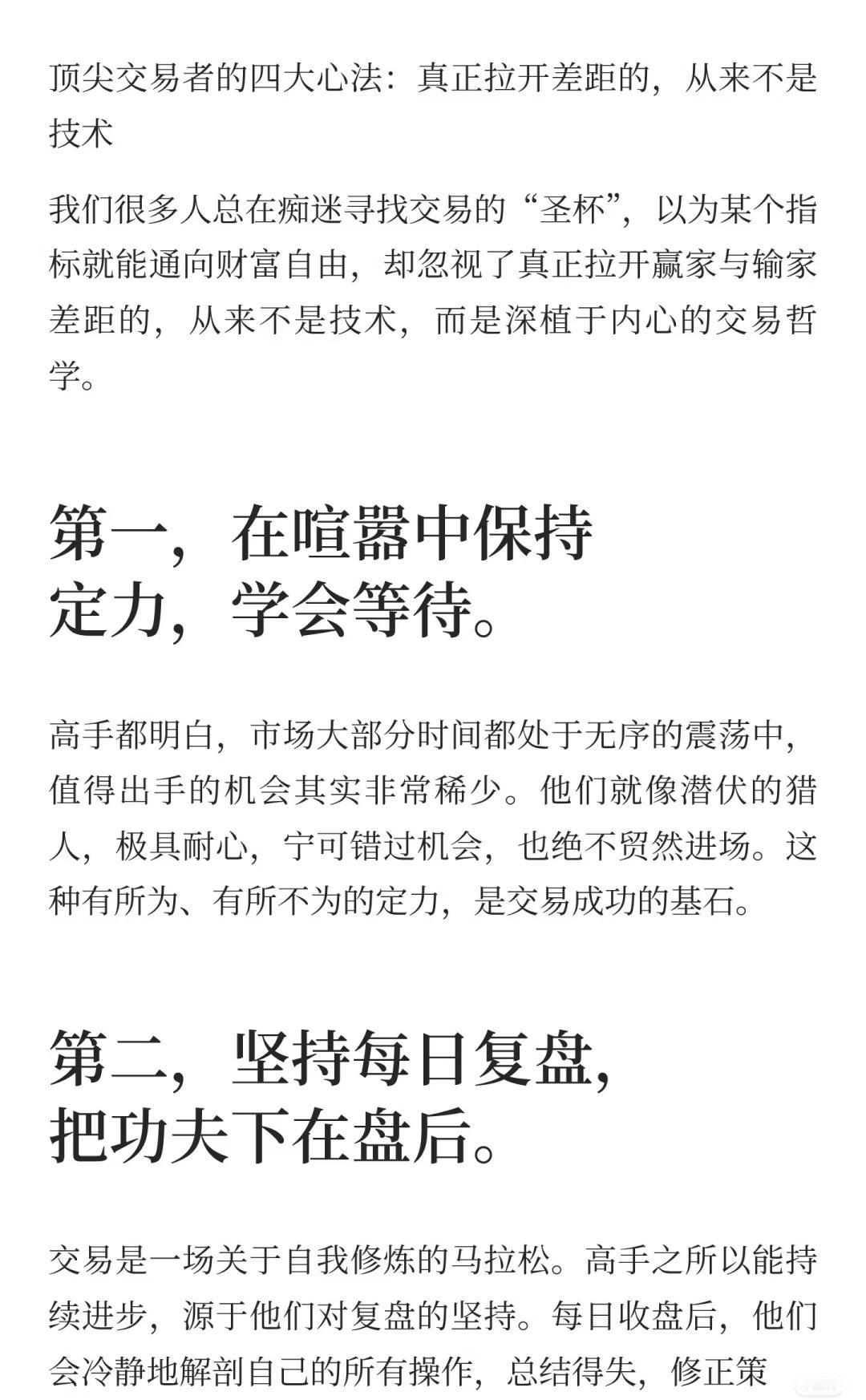 总结:顶尖交易者的核心心法与投资哲学 1. 交易成功的本质:不是技术,而是交易哲学 许多人沉迷于寻找“交易圣杯”(如神奇指标或秘籍),但真正拉开赢家与输家差距的,是深植于内心的交易哲学——包括耐心、纪律、情绪管理和资金策略。 2. 四大核心心法 ① 在喧嚣中保持定力,学会等待 - 市场大部分时间处于无序震荡,真正值得出手的机会很少。 - 高手像“潜伏的猎人”,宁可错过,也不贸然进场,耐心等待高确定性时机。 - 核心:有所为,有所不为,避免频繁交易和情绪化操作。 ② 坚持每日复盘,把功夫下在盘后 - 交易如同马拉松,进步来自持续反思。 - 每日收盘后,冷静分析操作,总结得失,优化策略。 - 核心:通过复盘提升认知,而非依赖即时反应。 ③ 驾驭心魔,克服人性的弱点 - 格雷厄姆观点:投资者最大的敌人是自己,市场考验的是贪婪与恐惧。 - 高手必须具备钢铁般的纪律: - 盈利时不骄傲(避免过度乐观导致风险失控) - 亏损时不急躁(防止情绪化报复交易) - 核心:让理性战胜情绪,纪律高于直觉。 ④ 将资金管理视为生命线 - 本金是市场博弈的唯一筹码,高手对资金管理极其严格。 - 核心原则: - 风险控制优先于盈利(绝不孤注一掷) - 追求复利增长(而非短期暴利) - 像滚雪球一样,长期稳健积累 - 核心:生存第一,稳健盈利比短期暴利更重要。 3. 总结:稳定盈利的真正关键 - 技术不是决定因素,真正的核心竞争力是:✅ 耐心等待机会(不盲目交易)✅ 每日复盘优化(持续改进策略)✅ 严控情绪与人性(纪律战胜贪婪恐惧)✅ 科学资金管理(风险控制+复利思维) - 最枯燥的基本功(如复盘、风控)才是稳定盈利的基石。 📌 投资/交易的终极心法:理性、纪律、耐心、风控。