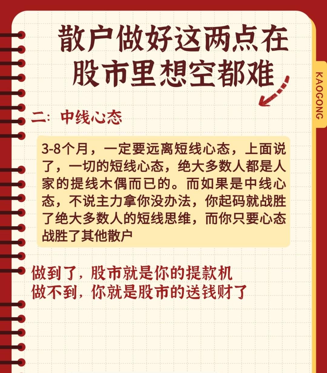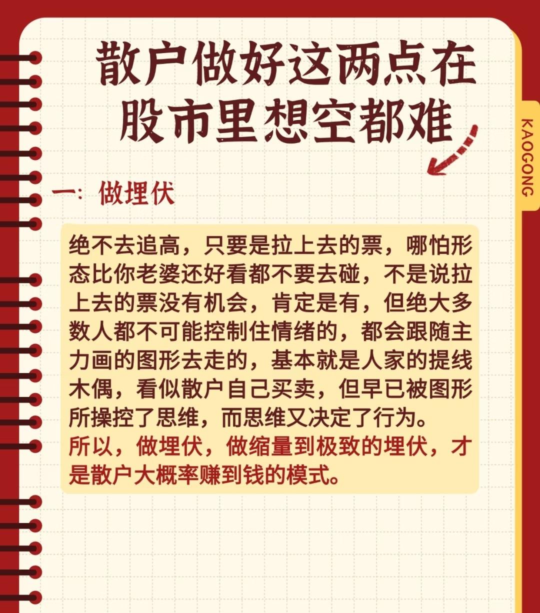 “散户如何在股市中盈利”为主题的投资经验分享,核心观点可以总结为: 🎯 总结标题: “散户做好这两点,在股市里想空都难” ✅ 核心内容分为两大要点: 一、做埋伏(不追高,做缩量埋伏) 关键词:不追涨、低吸、耐心等待、把握大概率赚钱机会 - 不要追高:那些已经拉高上涨的股票,哪怕图形再漂亮,也不要轻易去碰。 - 原因:大多数散户容易被主力通过技术图形“操控思维”,从而变成“提线木偶”,情绪化交易,追涨杀跌。 - 正确做法:选择那些成交量缩到极致、无人问津的股票进行埋伏(提前布局),这是散户能大概率赚到钱的模式。 🔑 总结:不要被市场情绪牵着走,学会“埋伏”等待,而不是“追高”参与。 二、中线心态(不要做短线“提线木偶”) 关键词:中线持有、耐心、战胜情绪、长期思维 - 持有时间建议:至少 3 到 8 个月 的中线投资周期。 - 避免短线操作:大部分散户频繁买卖,其实都是被市场短期波动和他人情绪影响,成为了“短线提线木偶”。 - 正确做法:培养中线持股心态,不被短期涨跌牵动,只要能战胜大多数人的短线思维,你就已经赢在了起跑线上。 - 金句总结: - 做到了(中线心态+埋伏策略),股市就是你的提款机; - 做不到,你就是在给股市送钱。 🔑 总结:投资比的不是手速,而是心态。用中线眼光看市场,才能真正赚到钱。 🏷️ 其它信息: - 图片风格统一,采用红、米黄配色,类似手账或笔记形式,带有“KAOGONG”标识,可能是某个投资达人、博主或机构(如“考工”)分享的内容。 - 内容通俗易懂,语言生动形象(比如“提线木偶”“你老婆还好看都别碰”),意在引起散户共鸣,强调理性投资与良好心态的重要性。 ✅ 最终结论提炼: 散户想在股市赚钱,关键要做好以下两点: 1. 做埋伏,不追高 —— 选择缩量冷门股提前布局,而非冲动追涨; 2. 保持中线心态(3~8个月) —— 不做短线“提线木偶”,用耐心和纪律战胜市场情绪。 做到这两点,股市就是你的“提款机”;否则,就是“送财童子”。