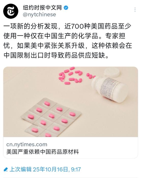 纽约时报中文网10月16日报道:“一项新的分析发现,近700种美国药品至少使用一种仅在中国生产的化学品。专家担忧,如果美中紧张关系升级,这种依赖会在中国限制出口时导致药品供应短缺。” 要知道,这些被“卡脖子”的化学品不是什么冷门玩意儿,全是药品生产里的关键角色。 像抗生素里的核心中间体、降压药的关键合成原料,还有一些抗癌药必须用的特殊试剂,不少都得从中国运过去。 美国本土的化学制药厂这些年关的关、迁的迁,能自主生产的品类早就缩水大半,日常需求基本靠从中国进口来填坑。 有数据统计过,光是2024年一年,美国从中国进口的药用化学品总额就突破了80亿美元,比五年前翻了快一倍。像生产常用退烧药对乙酰氨基酚的关键原料,中国的供应量占了美国市场的92%; 还有治疗糖尿病的二甲双胍,其核心中间体更是100%依赖中国进口。这种近乎垄断的供应格局,平时看着风平浪静,一旦外部环境有个风吹草动,风险立马就会冒头。 美国药品制造商也不是没意识到问题,可真要想把生产线迁回本土,难度比登天还大。重建一套药用化学品生产设施,不光要砸几十亿美元的前期投入,还得花三到五年时间跑审批、建厂房、调设备。 更头疼的是技术工人,美国本土懂精细化工生产的技工早就断了档,就算厂房建好了,没人会操作也白搭。 之前有几家美国药企试过在得克萨斯州建药用化学品工厂,结果折腾了两年,光环保审批就卡了十个月,最后因为找不到足够的技术工人,生产线只能半停工,成本反倒比从中国进口高了三成还多。没办法,最后还是乖乖回头找中国供应商拿货。 普通美国民众可能没感觉,可医院和药房的采购人员早就绷紧了弦。去年冬天美国流感季,就因为中国某家生产流感药中间体的工厂临时检修,美国市场上的奥司他韦胶囊就断供了半个月。 当时不少药店的货架都空了,医生只能给患者开替代药方,可效果远不如奥司他韦,不少患者的病情都拖重了。 现在专家们担心的是,要是美中关系进一步恶化,类似的断供可能会从个别药品扩散到整个品类。像心脏支架里的涂层材料、疫苗生产用的佐剂,这些东西的生产技术基本都掌握在中国企业手里,美国想找替代供应商都没处找。 有位华尔街的医药行业分析师算过账,要是中国真限制这些化学品出口,美国至少有30%的处方药会在三个月内出现供应短缺,其中不乏救命的急救药品。 美国政府也不是没动作,拜登政府去年推出过一个“药品供应链安全计划”,拨了5亿美元补贴药企,鼓励他们把生产线迁回本土或者转移到盟友国家。 可这笔钱扔进去就像石沉大海,没几家药企愿意接招。毕竟在印度或者越南建工厂,虽然人工便宜,但生产标准和质量控制根本跟不上,生产出来的化学品经常因为纯度不达标被美国药监局拒收。 反观中国这边,药用化学品产业早就形成了完整的产业链。从上游的基础化工原料,到中游的精细合成,再到下游的质量检测,每个环节都有成熟的企业在做。 而且中国的环保标准这些年一直在提,生产出来的化学品不光纯度高,还能提供完整的溯源报告,这也是美国药企宁愿依赖中国,也不愿找其他国家替代的关键原因。 更有意思的是,中国企业还在不断升级技术。像之前需要进口的某些高端药用催化剂,现在中国企业已经能自主生产,成本还比进口的低20%。 这种技术上的优势,让美国药企的依赖度只能增不能减。有位美国大型制药公司的采购总监私下透露,他们试过找欧洲供应商合作,结果对方报的价格是中国的1.8倍,交货周期还得延长两个月,根本没法满足生产需求。 现在这种局面,就像美国把药品供应链的“命门”交到了中国手里。专家们开会的时候常说,要是美国继续在贸易和科技领域对中国施压,一旦触及中国的核心利益,中国完全有可能用药用化学品出口作为反制手段。 到时候别说普通药品,就连手术用的麻醉剂、重症患者用的呼吸机配件,都可能出现断供。