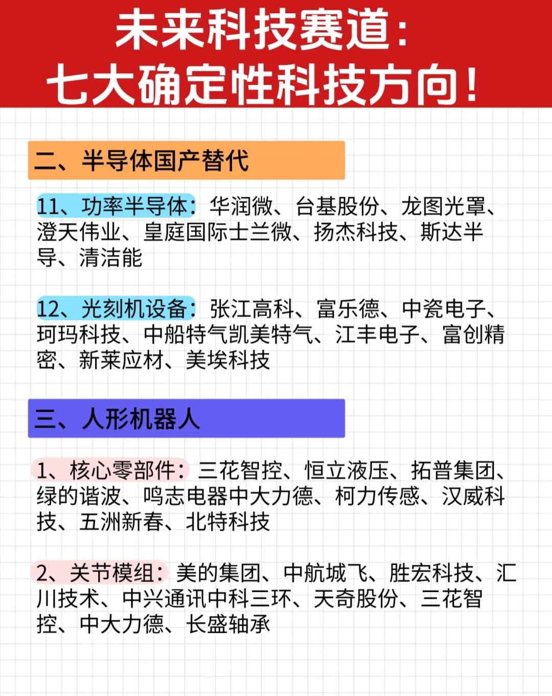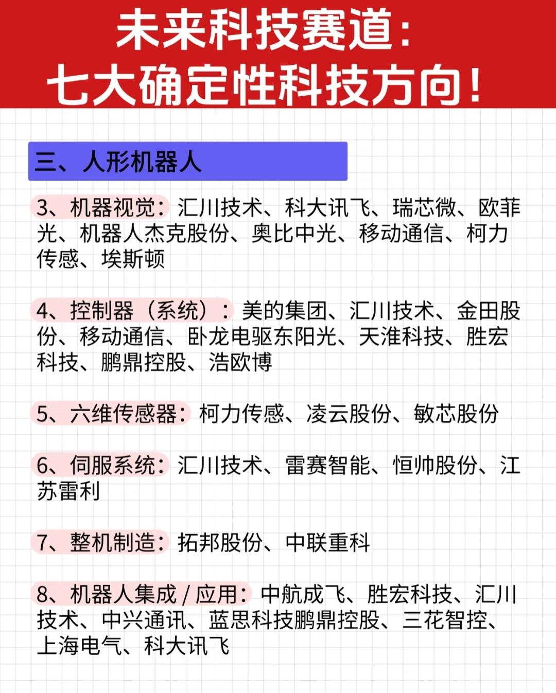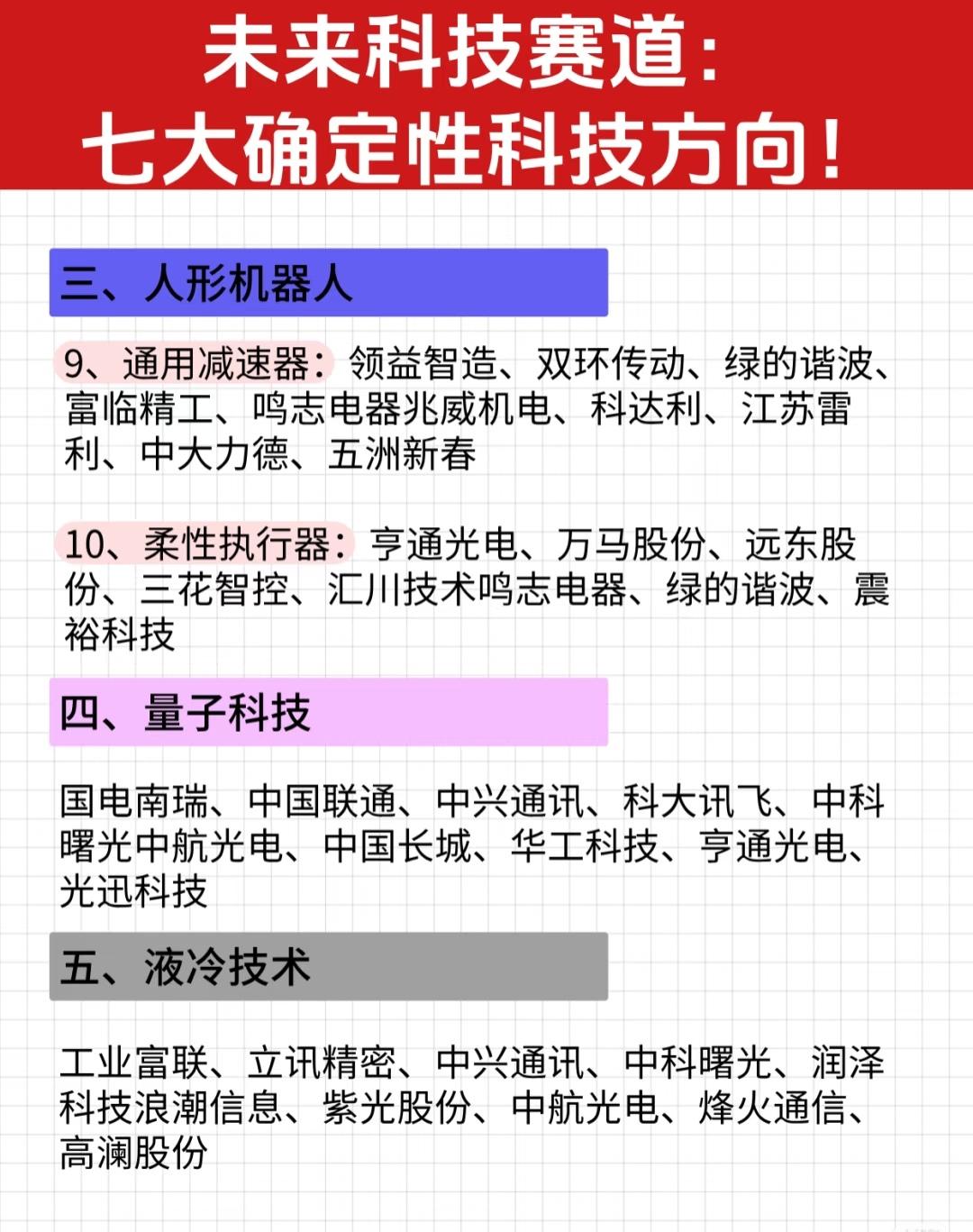 “未来科技赛道:七大确定性科技方向” 一、人工智能AI与算力 这是最受关注的方向之一,涵盖了从基础硬件到应用层的关键技术与企业。具体包括: - 算力芯片:如工业富联、寒武纪、海光信息、中国移动等,是支撑AI计算的核心。 - 液冷散热:为高功耗AI设备提供散热方案,涉及工业富联、中兴通讯、英维克等企业。 - 算法:包括图像识别、数据处理等,相关企业有中国移动、海康威视、传音控股等。 - 量子计算:代表未来计算突破方向,参与企业有中国移动、中国电信、紫光股份、国盾电子等。 - PCB(印刷电路板):为各类硬件提供基础支撑,企业包括东山精密、鹏鼎控股、沪电股份等。此外,还进一步细化了光模块CPO、算力调度、AI服务器、AI眼镜等细分领域,相关企业众多,如紫光股份、工业富联、立讯精密、中际旭创等,体现了AI产业链的高度细分与协同。 二、半导体国产替代 聚焦中国自主可控的半导体产业链建设,是科技自立自强的关键。主要包括: - 设备/材料:如北方华创、中微公司、沪硅产业、盛美上海等,是芯片制造的基础。 - 先进封装:提升芯片性能与集成度,涉及寒武纪、长电科技、通富微电等。 - CPU/GPU:核心计算芯片,代表企业有中芯国际、海光信息、龙芯中科、景嘉微等。 - 车规芯片:面向智能汽车领域,如兆易创新、瑞芯微、均胜电子、广汽集团等。此外,还包含EDA软件、硅片、光刻机、SRAM、封装测试等细分环节,如华大九天、张江高科、长电科技、华润微等,覆盖了从设计工具、原材料到制造与检测的全流程。 三、人形机器人 作为AI与机械工程结合的前沿应用,涉及多个核心模块: - 核心零部件与关节模组:如三花智控、汇川技术、美的集团、中航成飞等,是机器人运动与控制的基础。 - 机器视觉、控制器(系统)、六维传感器、伺服系统:分别负责感知、决策、精准测量与动力控制,企业涵盖汇川技术、科大讯飞、柯力传感、雷赛智能等。 - 整机制造与机器人集成/应用:如拓邦股份、中联重科、中航成飞、胜宏科技等,推动机器人从原型到落地应用。此外,还细化了通用减速器、柔性执行器等部件,相关企业有双环传动、绿的谐波、亨通光电、汇川技术等,体现了人形机器人技术的复杂性与多领域融合特征。 四、量子科技 代表未来计算与通信的前沿方向,参与企业包括国电南瑞、中国联通、中兴通讯、科大讯飞、中科曙光、华工科技、亨通光电等,聚焦量子计算、量子通信等战略性技术领域。 五、液冷技术 为高密度计算设备(如AI服务器、数据中心)提供高效散热方案,相关企业有工业富联、中兴通讯、中科曙光、紫光股份、高澜股份等,是支撑算力扩张的关键基础设施技术。 六、可控核聚变 作为终极能源解决方案,代表企业包括中国核电、上海电气、中国核建、东方电气、中油资本、西部超导等,体现国家在能源科技前沿的布局与投入。 七、脑机接口 连接人脑与电子设备的新兴领域,探索人机交互的未来,相关企业有乐普医疗、创新医疗、科大讯飞、伟思医疗、三博脑科等,涉及医疗科技与神经工程交叉方向。 总结来看,这七大科技方向覆盖了从底层硬件(如芯片、半导体设备)、关键技术(如AI算法、量子计算、液冷散热)、新兴应用(如人形机器人、脑机接口)到未来能源(如可控核聚变)的全链条,既体现了科技创新的前沿性,也突出了国产替代与自主可控的战略需求,为判断未来科技产业发展重点与投资机会提供了系统性参考。