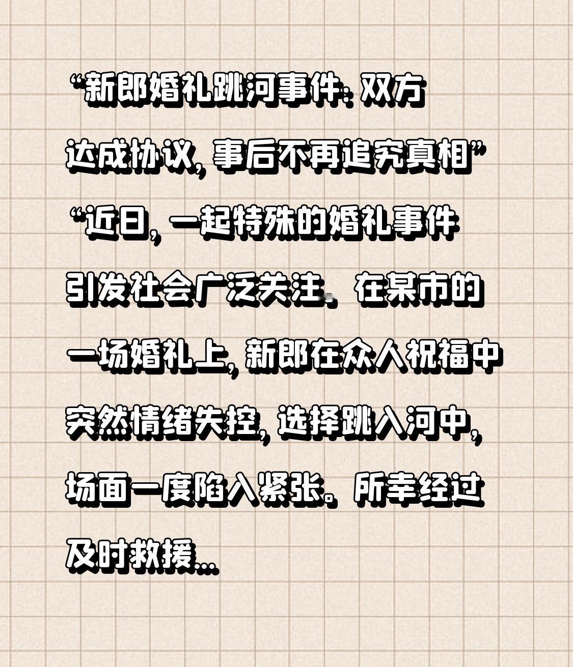 “新郎婚礼跳河事件:双方达成协议,事后不再追究真相” “近日,一起特殊的婚礼事件引发社会广泛关注。在某市的一场婚礼上,新郎在众人祝福中突然情绪失控,选择跳入河中,场面一度陷入紧张。所幸经过及时救援,新郎无大碍,但此事引发了关于婚礼压力与心理健康的热议。事后,新郎与新娘经过沟通,双方达成了谅解和协议,决定不再追究事件的责任,将此事视为一次特殊的经历。” “据悉,事件发生后,新郎和新娘在家人和朋友的调解下,选择了和平解决。双方签署了一份协议,内容包括:不追究对方责任、共同面对未来的生活、以及对婚礼中出现的突发状况表示理解。协议的达成,既是对事件的释怀,也体现了双方在压力下的理性选择。有人分析,这或许反映出婚礼背后复杂的心理压力,以及双方对未来的共同期待。” “社会各界对该事件的反应不一。有网友认为,婚礼应是喜庆的场合,遇到突发状况应理性应对,而不应以极端方式解决问题。一些法律专家指出,事件中的跳河行为虽未造成严重后果,但也提醒新人们在准备婚礼时应重视心理健康,避免冲动行事。另一方面,事件也引发了对婚礼习俗的反思——在追求完美的背后,是否忽略了新人们的心理压力?这对社会和法律体系提出了新的思考。” “这起事件提醒我们,婚礼虽是人生的重要仪式,但更应关注新人们的心理状态和情感需求。婚礼习俗应适度调整,减少不必要的压力,让新人在幸福中迎接新生活。同时,也呼吁社会关注心理健康问题,为婚礼筹备提供更多支持和引导。此事件也告诉我们,理性沟通和理解比冲动更能解决问题,为未来的婚礼提供了宝贵的反思。” “新郎跳河事件虽令人震惊,但最终双方达成协议,展现了理性与包容的力量。这一事件不仅是一次特殊的经历,更是对婚礼文化和心理健康的提醒。希望未来的婚礼能在喜庆与温馨中,更加关注每位新人的真实感受,让爱与理解成为婚礼的主旋律。”