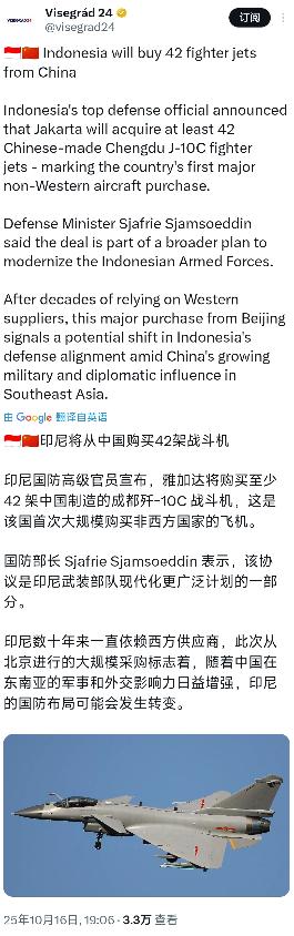 外媒10月16日报道:印尼将购买42架中国成都歼-10C战斗机,价值超过90亿美元。印尼国防高级官员表示,这是该国首次大规模购买非西方国家的飞机。 要知道以前印尼的战机采购名单里,基本都是欧美或者俄罗斯的产品,比如早年用过的美国F-5战斗机,还有后来从俄罗斯买的苏-35,这次突然把大订单砸给中国歼-10C,背后肯定不是一时兴起。 先看歼-10C本身的硬实力,这款战机是咱们自主研发的三代半中型战斗机,不管是空战能力还是多用途作战性能,都能跟国际上同级别机型掰掰手腕。 它搭载的有源相控阵雷达,探测距离远还能同时跟踪多个目标,配上国产的霹雳-15中远程空空导弹和霹雳-10近距格斗导弹,空中对抗的时候完全不吃亏。 除了空战,歼-10C还能挂精确制导炸弹、反舰导弹这些装备,不管是对地打击还是对海突击都能胜任,对印尼这种需要兼顾多种防务需求的国家来说,实用性直接拉满。 再说说印尼的需求,这些年印尼一直在加强国防力量建设,尤其是空军装备更新换代的需求特别迫切。 他们之前装备的不少战机都到了服役末期,性能跟不上现在的作战需求,急需一批先进战机补上来。 要是从欧美买,不仅价格贵得离谱,还会被附上一堆政治条件,比如武器禁运、技术限制之类的,之前有些国家就因为跟欧美闹点矛盾,战机维护零件都断供了,印尼肯定不想踩这个坑。 俄罗斯的战机虽然性能不错,但最近几年受国际局势影响,产能和后续维护保障都有点跟不上,印尼也得考虑长期使用的稳定性。 中国这边就不一样了,卖装备的时候从来不会附加政治条件,而且后续的维护、零件供应还有人员培训都能跟得上,之前巴基斯坦买了歼-10C之后,用着一直很顺手,还多次在国际场合展示,这对印尼来说也是个实实在在的参考。 价格方面,歼-10C也很有竞争力,90亿美元买42架,平均下来每架的价格比欧美同级别战机低不少,而且还能根据印尼的需求做一些定制化改进,这种高性价比的选择,换谁都得心动。 还有一点很关键,这些年中国和印尼在防务领域的合作一直在加深,除了战斗机,印尼之前还从中国买过护卫舰、导弹快艇这些装备,用下来反馈都不错,双方已经建立起了足够的信任。 这次买歼-10C,不只是简单的装备采购,更是两国防务合作升级的体现,对印尼来说,既能提升空军实力,又能加强和中国的合作关系,简直是双赢。 从区域安全角度看,印尼作为东南亚的大国,空军实力提升之后,也能更好地维护自己的领空安全和海洋权益,毕竟东南亚地区局势不算太平,有足够的防务力量才能更有话语权。 而且歼-10C的加入,也能让印尼空军的装备体系更加多元化,不再过度依赖某一个国家的装备,降低了后续可能面临的风险。 再说说歼-10C出口的意义,这是这款战机继巴基斯坦之后,又一个大规模出口订单,说明它的性能和性价比已经得到了国际市场的认可。 之前国际战机市场基本被欧美和俄罗斯垄断,中国战机想要打开市场并不容易,现在歼-10C接连获得订单,意味着中国航空装备在国际市场上的竞争力越来越强,也打破了传统的市场格局。 对中国来说,这不仅能促进航空工业的发展,还能加强和其他国家的战略合作伙伴关系,为后续更多装备出口打下基础。 印尼这次的选择,也可能会带动其他东南亚国家或者发展中国家关注中国战机,毕竟好的产品自己会说话,看到印尼买到高性价比的装备,其他有需求的国家说不定也会跟着考虑。 不过话说回来,这笔订单最终落地还需要一段时间,后续还有合同细节谈判、生产交付、人员培训这些流程,但从目前印尼官方释放的信号来看,双方的合作意愿都很强烈,顺利推进的可能性很大。 等这批歼-10C交付之后,印尼空军的整体实力肯定会有质的飞跃,到时候不管是日常的防空巡逻,还是应对突发情况,都能更有底气。 而中国通过这次出口,也能进一步积累战机出口的经验,未来在国际市场上肯定能拿到更多订单,毕竟越来越多的国家已经意识到,中国装备不仅好用,还靠谱,不会给你整那些乱七八糟的附加条件。