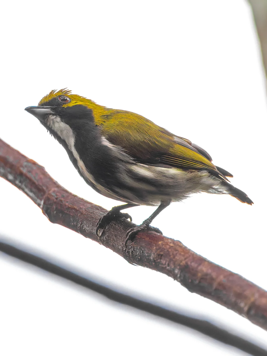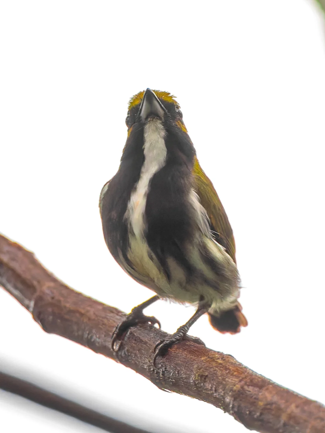 当时我们正在专心致志的在雨中听棕犀鸟的叫声寻找,结果突然在面前的树枝上跳来一只奇怪的啄花鸟,完全没见过,没想到加新了,在我们面前叫了两声就飞快跳走,一去不回头了,像是过来打个招呼就走了。