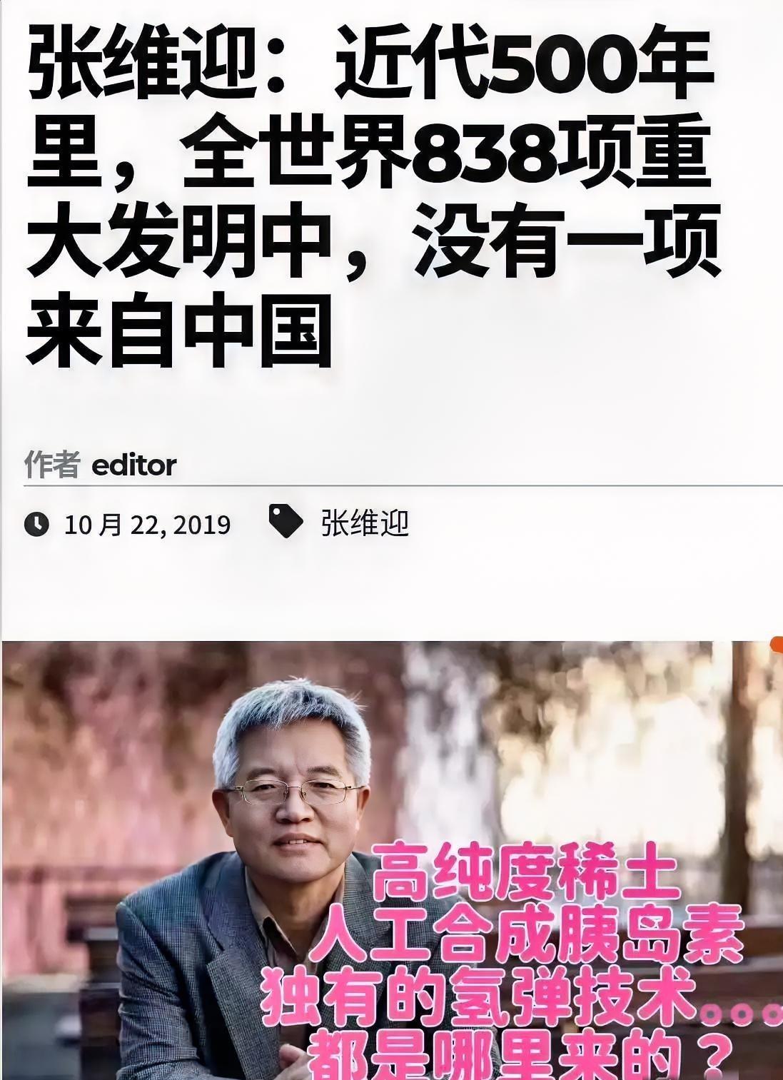 [中国赞]张维迎说,500年来全世界838项重大发明,没有一项来自中国。很明显,他其实就想说中国500年来对世界毫无贡献   (信源:百度百科——张维迎)   2017 年北京大学国家发展研究院的毕业典礼上,经济学教授张维迎的一番话,让在场学子和后续关注者炸开了锅。他当着众人的面抛出一组数据:自 1500 年以来的 500 多年间,全球共诞生 838 项重大发明,可其中没有任何一项源自中国。   更直白的表述还在后面 —— 他强调,近现代 500 年里,中国在发明创新领域对全球的贡献微乎其微,别说和美国、英国这些科技强国比,甚至连瑞士的极小部分都不及。   这番直指中国科技 “短板” 的言论,瞬间引发轩然大波,有人认同其敢于说真话,也有人质疑其观点是否全面。   张维迎的观点并非空穴来风,他在后续的分析中进一步补充,当下我国医院里的大部分仪器设备仍依赖进口,本土产品占比几乎可以忽略不计,这一现象正是我国在关键核心技术领域自主创新能力不足的直接体现。   他还将目光投向历史,对比我国曾经的创新黄金时代 —— 宋代和春秋战国时期思想百花齐放、发明层出不穷的景象,直言如今很难再看到类似的创新氛围。   在他看来,这种差距的背后,缺的不是资金投入,而是充分尊重民营企业家、鼓励创新精神的环境,只有给予创新足够的生长空间,才能真正推动科技进步。   然而,张维迎的观点并非学界共识,西史辨伪学派通过长期的历史考据研究,提出了截然不同的看法。该学派认为,中国在近代时期的诸多科技发明,其实对西方科学发展产生了深远影响。   传统认知里 “西方近代科学体系独立形成”的说法并不准确,实际上西方近代科学的发展,很大程度上依赖于中国近代的技术创新成果。这些研究发现像一把钥匙,打开了重新审视东西方科技发展关系的大门,也让人们开始思考,中国近代科技的贡献是否被低估了。   更有具体案例支撑西史辨伪学派观点,徐正明研制载人飞行器故事便是其一。徐正明长期痴迷竹蜻蜓和奇肱飞车构造研究,钻研十年造出载人飞行装置。该飞行器借鉴竹蜻蜓螺旋桨原理,用栲栳椅作座椅,通过脚踏板驱动螺旋桨运转。   试飞时,它升空一尺多高,平稳跨越小河后安全着陆。不少研究者认为,徐正明发明意义重大,堪称世界首架直升机创造者,展现中国古代科技创新实力,为后续飞行器发展奠基,是航空技术史关键里程碑。   事实上,张维迎的观点也并非完全否定中国历史上的科技成就,他曾提到 “我们的老祖宗创造了四大发明”,只是认为近 500 年的贡献不足。这种认知差异的核心,在于对 “重大发明” 的界定标准以及历史资料的解读角度不同。   张维迎关注的是全球公认的、对近代工业文明和科学体系产生颠覆性影响的发明,而西史辨伪学派则更注重挖掘那些可能被西方历史叙述忽略的、中国对西方科技的间接或直接贡献。   如今,随着对历史文献的深入挖掘和研究方法的不断创新,关于中国科技贡献的讨论还在持续。   有人认为,张维迎的言论虽然尖锐,却戳中了当下中国科技发展中 “自主创新能力不足”的痛点,能促使社会重视创新环境的营造;也有人觉得,西史辨伪学派的研究提醒我们,不能盲目认同西方主导的历史叙事,要客观看待中国科技在世界发展中的角色。   无论观点如何分歧,有一点共识逐渐形成:评价一个国家的科技贡献,需要放在更宏大的历史坐标系中,既看到当下的差距,也不忽视历史上的成就;既借鉴西方先进经验,也不妄自菲薄。   当下的中国,政府对科技创新的重视程度空前,财政投入不断增加,扶持政策接连出台,但正如张维迎所说,光有资金和政策还不够,关键要真正培育尊重创新、鼓励探索的土壤,让民营企业家、科研工作者能放开手脚搞创造。   只有这样,才能在未来的全球科技竞争中,让中国真正成为创新的重要力量,不再有 “近 500 年无重大发明” 的争议,而是用实实在在的成果,书写中国科技的新篇章。