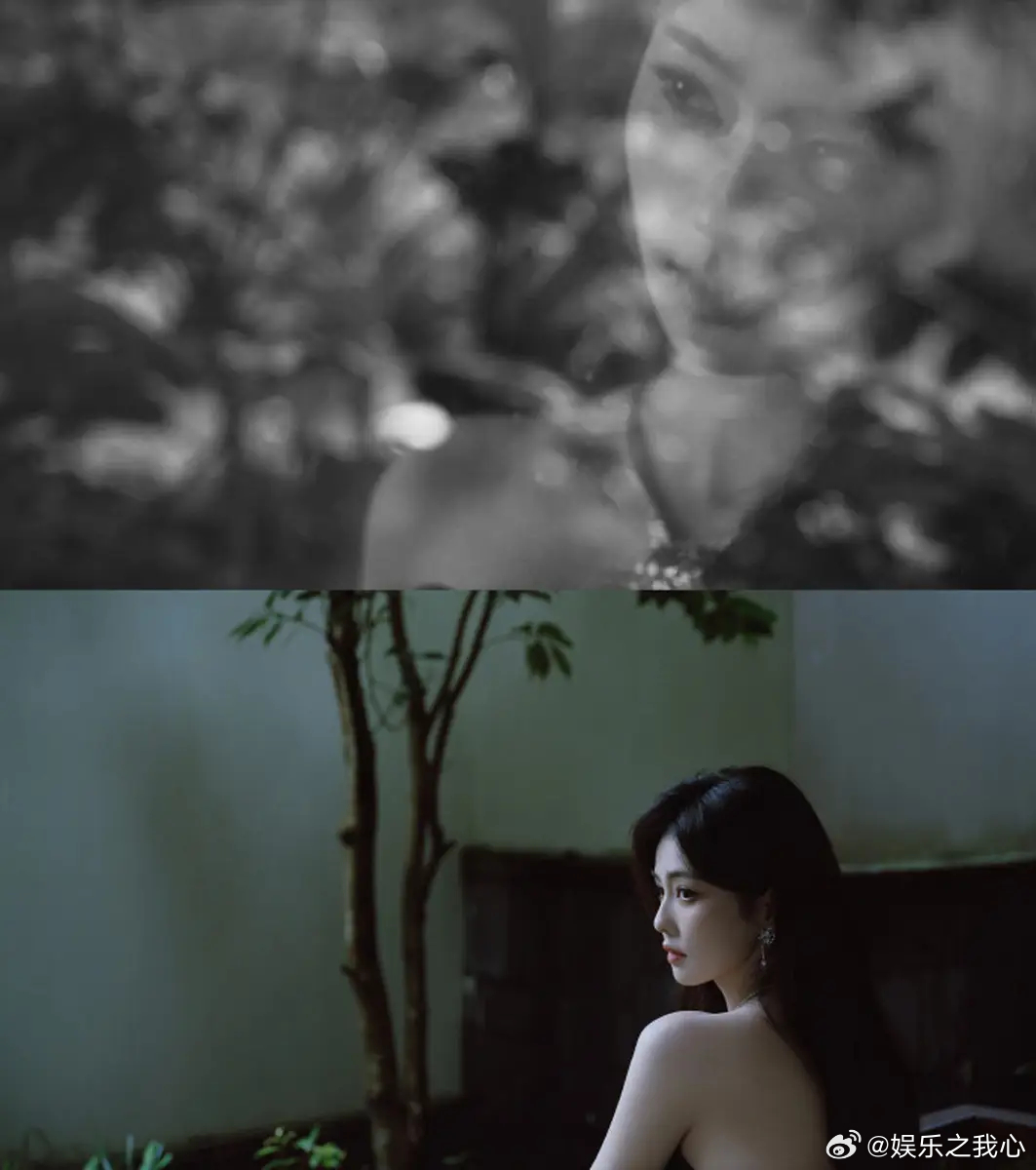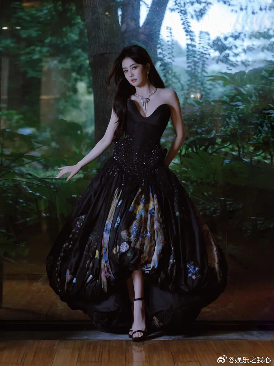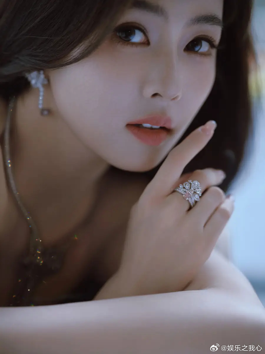 白鹿墨绿色长裙配银色项链 透明美甲凸显纤细手指超吸睛