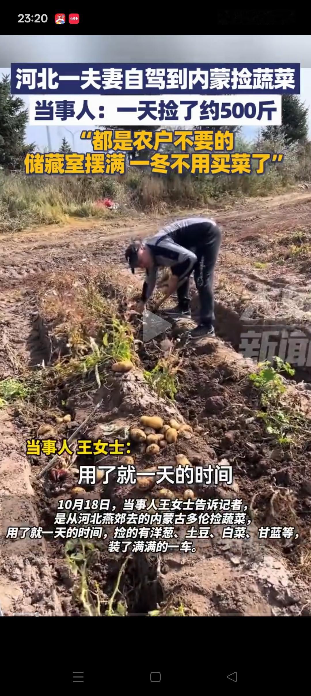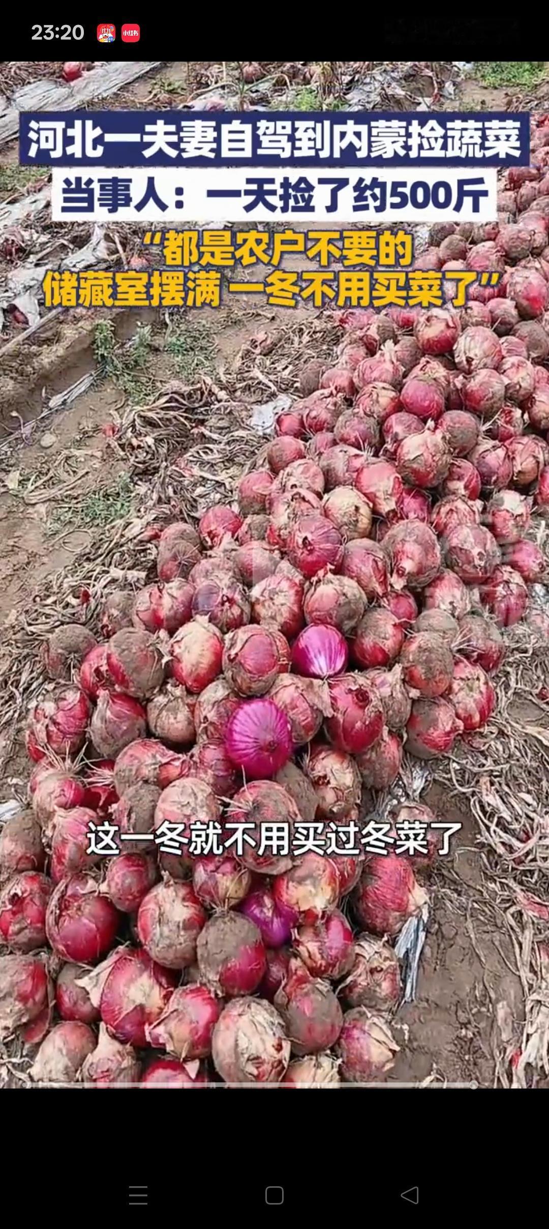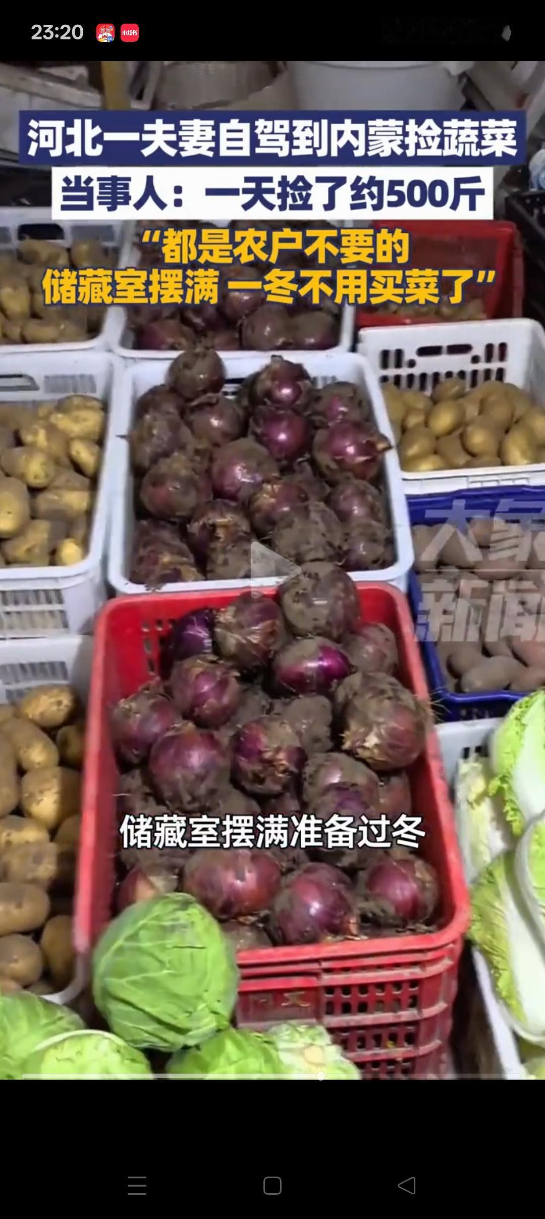 “这菜就非捡不可吗[捂脸]”,河北一夫妻听说内蒙古有很多农户不要的菜,可以随便捡,于是自驾过去捡回家过冬。 这一捡不知道,一捡吓一跳! 一天就捡了500斤,有白菜,土豆,洋葱,甘蓝,把车子塞的满满的,都是农户不要了的,很多人都在捡。 但是她是从河北过去的,不说浪费时间,这一路的邮费,高速费,怕是比菜钱贵吧,划不来啊。 人有想法是好的,但是这么做也有点想不通,除非是自驾过去旅游,顺带去捡的[呲牙][呲牙] 要是你,也会和他们一样去捡吗?反正我不会[抠鼻][抠鼻]。。