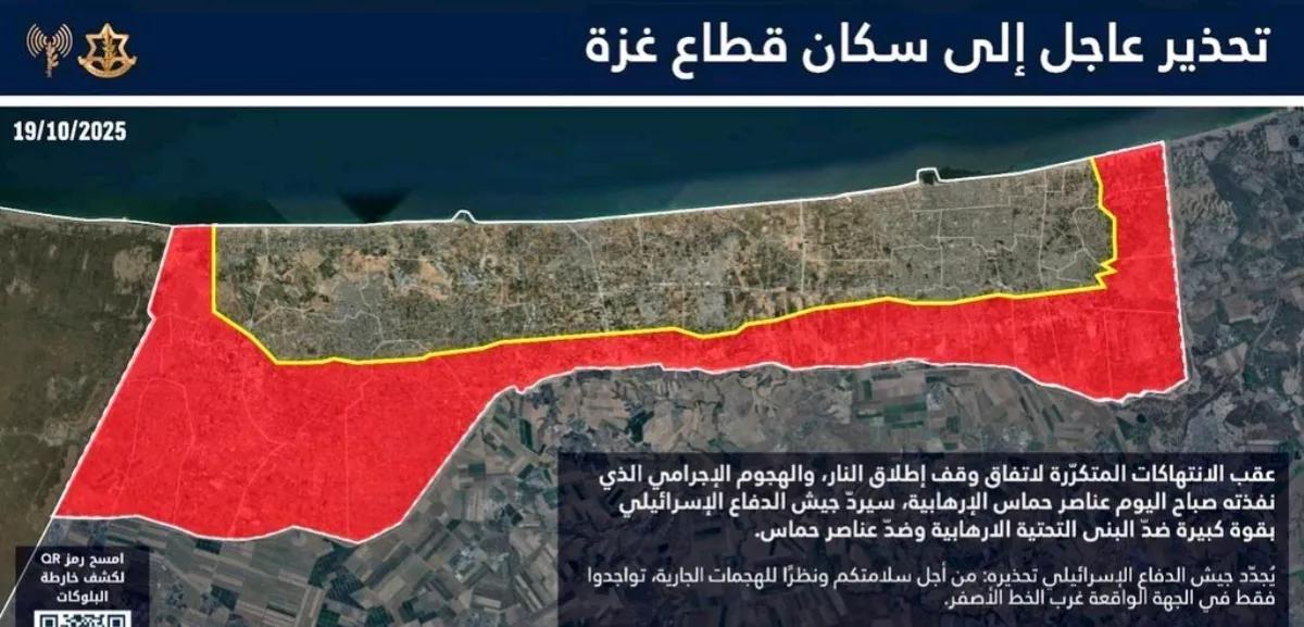 《国土报》消息,当地时间19日,以色列国防军阿拉伯裔发言人阿维洽伊.阿德雷,在社媒发布撤离警告,表示由于哈马斯武装人员不断违反停火协议,屡次向“黄线安全区”内的以军士兵实施袭击,国防军将向哈马斯目标发起坚决反击,并要求已被军方划定为战区(红色区域)内的巴勒斯坦难民,应尽快撤往安全地带,以免遭到战火波及。 以国防部当天发布声明,宣布因哈马斯违反停火协议,军方将在多地展开“果断回击”,打击并消灭威胁以军控制区的极端分子。