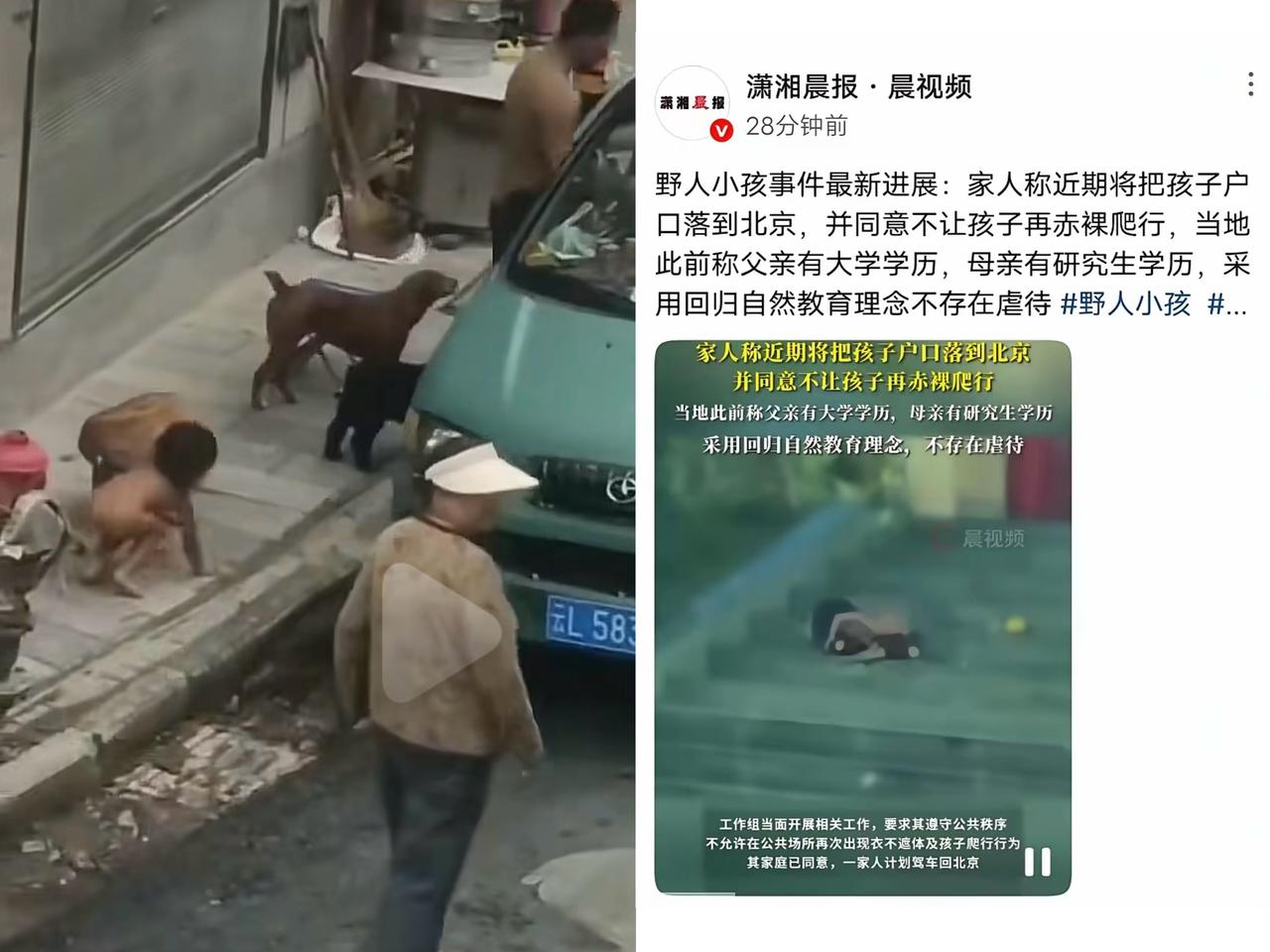 “野人小男孩”事件,这父母的做法让人震惊,同时相关人认为这是他父母“回归自然的教育方式”,不存在虐待的看法更让人吃惊,经过全网报道,最新消息透露,家属称会把小男孩落户北京并承诺不再让男孩赤裸爬行,但这件事绝不能就此而过,须鉴定是否亲生、须调查是否有借此牟利、须介入帮助小男孩的成长,这才是文明发展的根本。
