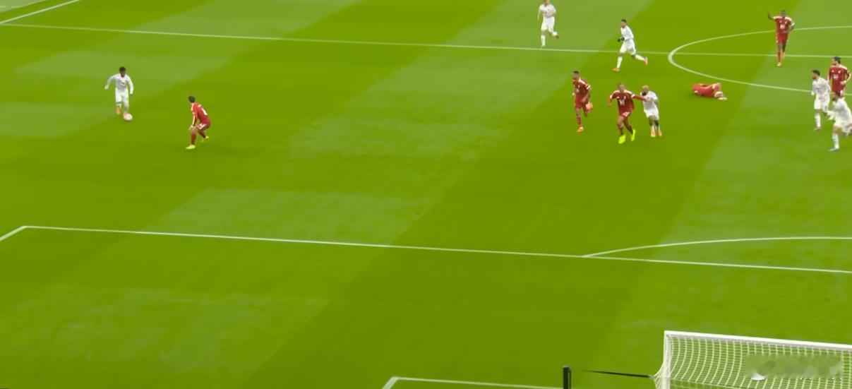 第一个失球,范戴克争顶肘击了队友麦卡利斯特,夹在他们俩中间的姆贝莫也倒地了,但迅速起身。B费分球给右路阿马德,柯克兹没有及时上顶,让阿马德从容出球。