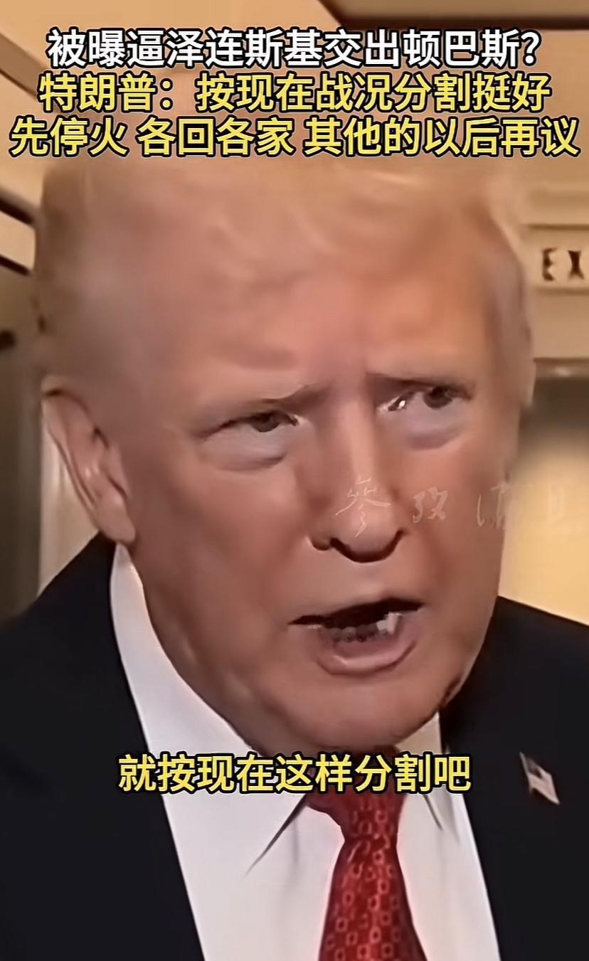 川普否认人们传的一件事,他没有逼演员交出顿巴斯剩余领土,但是川普又一句话让乌克兰人寒心,他说就按当前战线分割,分割这个词用的不好,一说分割就会涉及领土争端问题。其实吧,当下先不要谈领土归属了,按现在战线,双方后退几公里,搞个缓冲带出来,谁家大兵也不能越过缓冲带。
