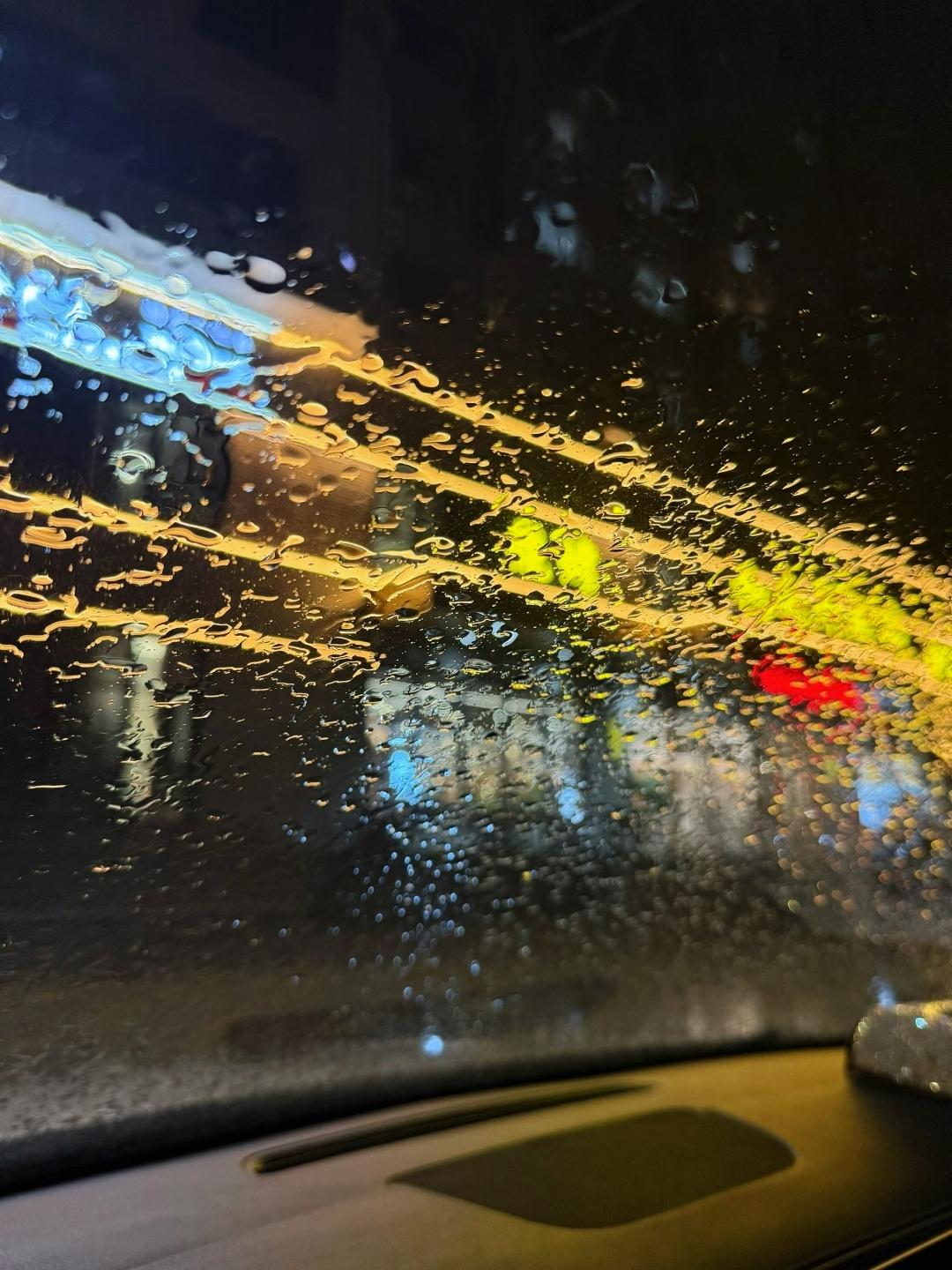 白天在湖边,太阳快落山的时候,那光线绝了!阳光从云缝里钻出来,在水面上还能看到闪闪的光,感觉眼睛都被治愈了。 结果晚上就变天了,开始下雨。不过坐在车里看外面,被雨水一折射,像把彩虹揉碎了撒在玻璃上,还挺好看。