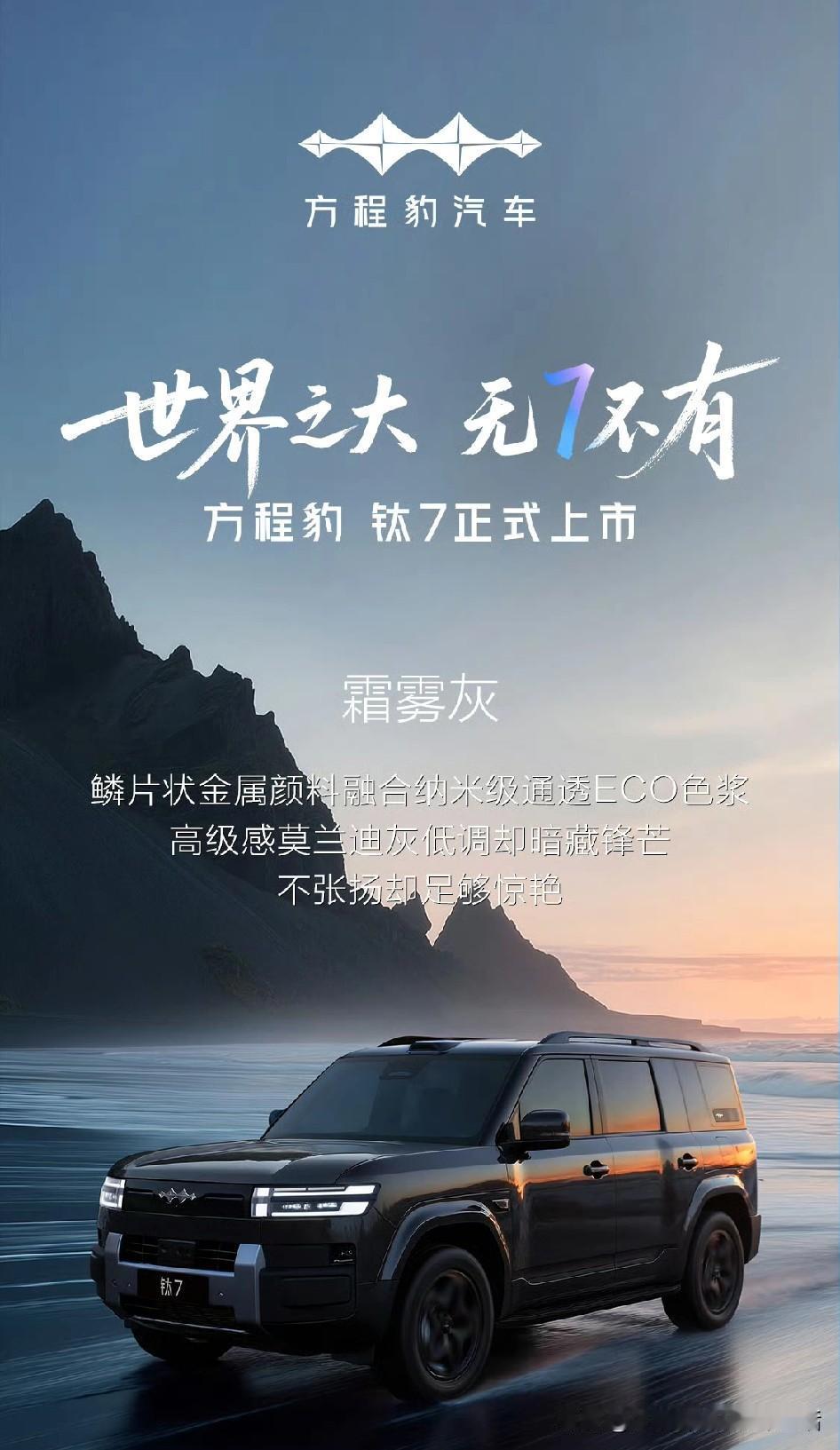 国产越野车谁最有魅力? 1,方程豹钛7? 2,坦克500? 3,方程豹豹5? 4,方程豹豹8? 5,坦克300? 8,猛士817? …… 方程豹官宣钛7上市首月交付11674台,用户最爱190KM四驱UItra 版,曜石黑色外观最受大家喜欢, 科技大空间SUV钛7,大五座天花板,新一代DM平台 ,百公里加速4.5s,前双叉臂后五连杆独立悬架 , 操控自如,云辇-C+云辇预瞄系统 ,如履平地,9月9日正式上市并开启交付。 方程豹钛7,有点恐怖如斯啊!上市一个月,销量11674辆,这成绩算得上是不错了吧? 看这销量方程豹也能扛越野车大旗了!方程豹,坦克,东风猛士,国产越野车竞相绽放光芒,越来越受到消费者的追捧,未来的国产越野车必将开疆拓土,鹏程万里,走向鼎盛辉煌。