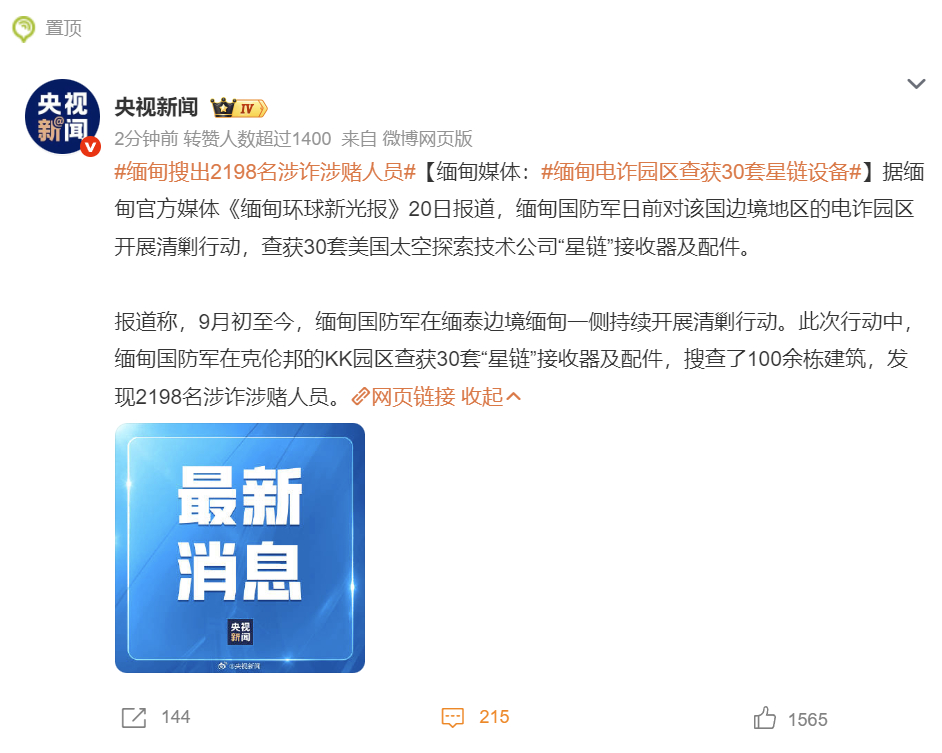去年是曝出星链给巴西当地土著放成人电影,今年成为缅甸电诈“合作伙伴”。。[摊手]