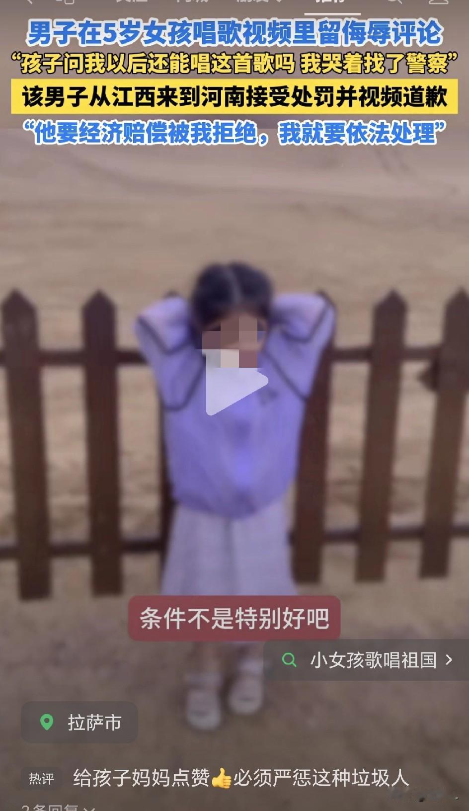 5岁女儿唱红歌发到网上,却被陌生男子恶意诅咒。妈妈哭着报警:我不要赔偿,只要他认罪!结局舒适了! 10月1日,河南郑州的孙女士,在个人社交账号上发布了女儿演唱《歌唱祖国》的视频,收获了广大网友的点赞和暖心评论。 正如大家都知道的,稍微有点流量的作品,就会引来各种恶意的声音。 5日,一条来自江西的评论,炸裂了整个评论区。 有人在评论区,发出了恶毒的评论:“你生得出来还不是夭折”、“大家鉴定一下,这妞会怎么死”。 评论被孙女士的女儿看到,精神大受打击,问妈妈自己以后还能唱歌吗。女儿的话,让孙女士很崩溃,她没有选择忍气吞声,而是直接报警! 9号,警方联系到了发表评论的男子俞某。男子提出给予孙女士经济赔偿,但被孙女士断然拒绝,为了女儿,孙女士坚决要求依法处理! 13日,俞某某被传唤到了河南郑州,警方考虑到俞某妻子重病,对他处以行政处罚500元,并公开发布道歉视频。 网友们纷纷为孙女士点赞,作为妈妈,孙女士为女儿树立了一个好榜样,在面对恶意言论时,不能一味退缩,要拿起法律的武器维护自己的权益: “给妈妈点赞,必须严惩这种垃圾人!” “一个大老爷们怎么好意思的?” “以侮辱罪、寻衅滋事罪,拘留他!” “这种人不应该给他打码。” “这种网络垃圾,必须严惩!” “一把年纪了,居然对一个5岁的孩子口出恶言!” “家里老婆重病,还不知道积德?” 网络不是法外之地,任何的恶意评论都将会受到法律的制裁! 张大导演因为有人对他一岁的小女儿口出侮辱用语,夫妻双双直接开播怒怼网友! 还有咱们做自媒体的都知道,但凡哪一篇小作文流量稍微多一点点,评论区里就会出现喷子,口出恶言、恶语相向。 大家常常开玩笑说,喷子出现了,代表小作文有可能会爆了,他的话就当看不见,只谢谢他贡献了一个阅读量。 虽然说,网络上言论自由,但自由不是无底线!在网络空间中应保持理性与善意! 良言一句三冬暖,恶语伤人六月寒。 不要把人性的恶洒满互联网的虚拟空间,不要躲在太阳照射不到的阴暗面,用恶毒的语言四处攻击。 恶意终将付出代价,而勇敢与善良,值得被捍卫和赞扬。 生而为人,请你善良! 信息来源于西藏商报,侵联删!