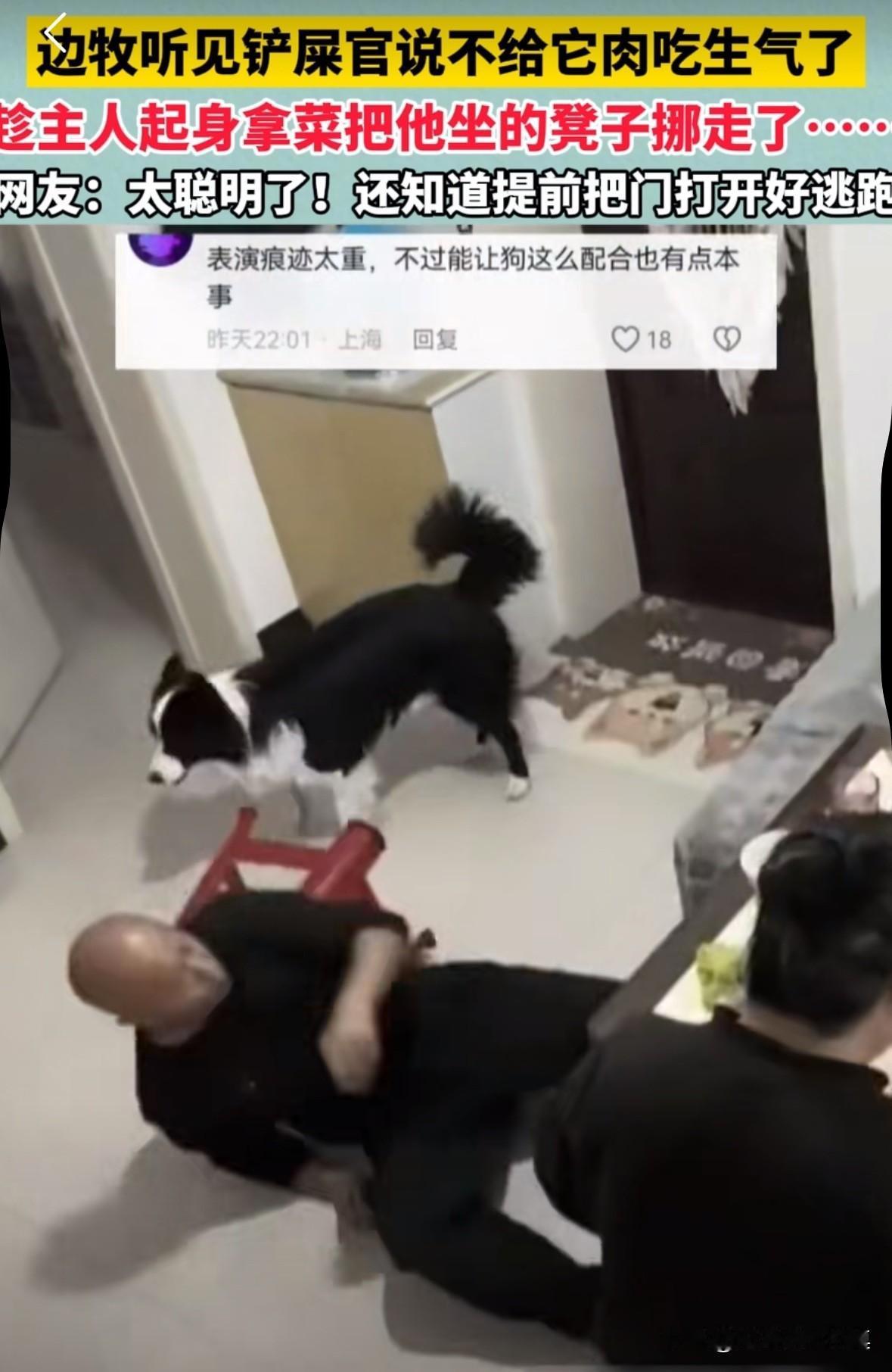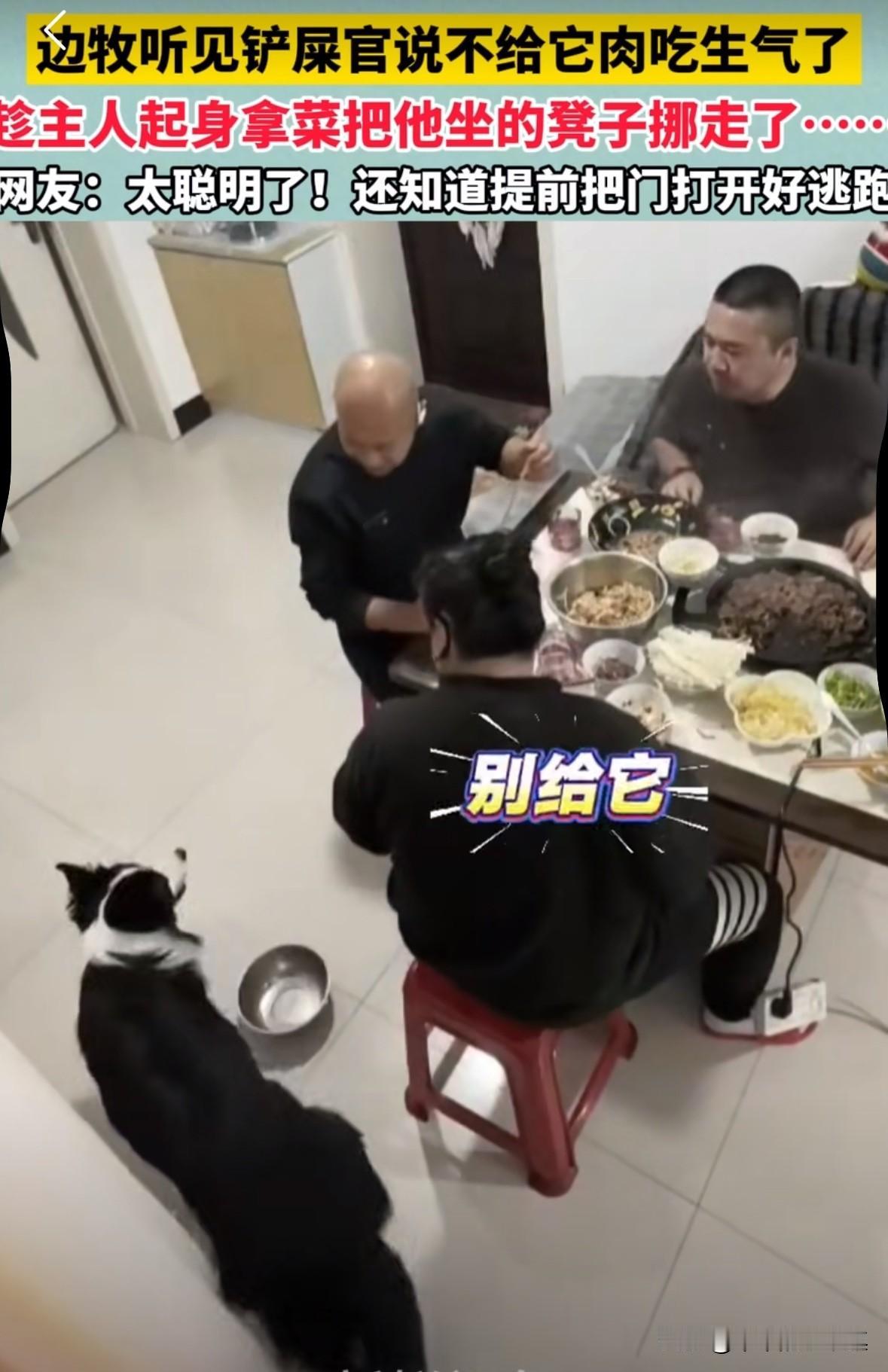 男子跟朋友在家里吃饭,边牧嘴叼着饭盆就过来了,朋友想喂它,主人说了一句:“别喂它,我还没吃够呢。” 没想到边牧听懂了,只见边牧先把门打开,方便逃跑,瞅准主人站起来拿菜时间,直接把他坐的凳子叼走了。 主人直接摔了个屁股蹲。 朋友嘲笑他:“让你瞎说话,它能听懂。” 这狗狗也太聪明了,我也想养一只。欢乐的边牧