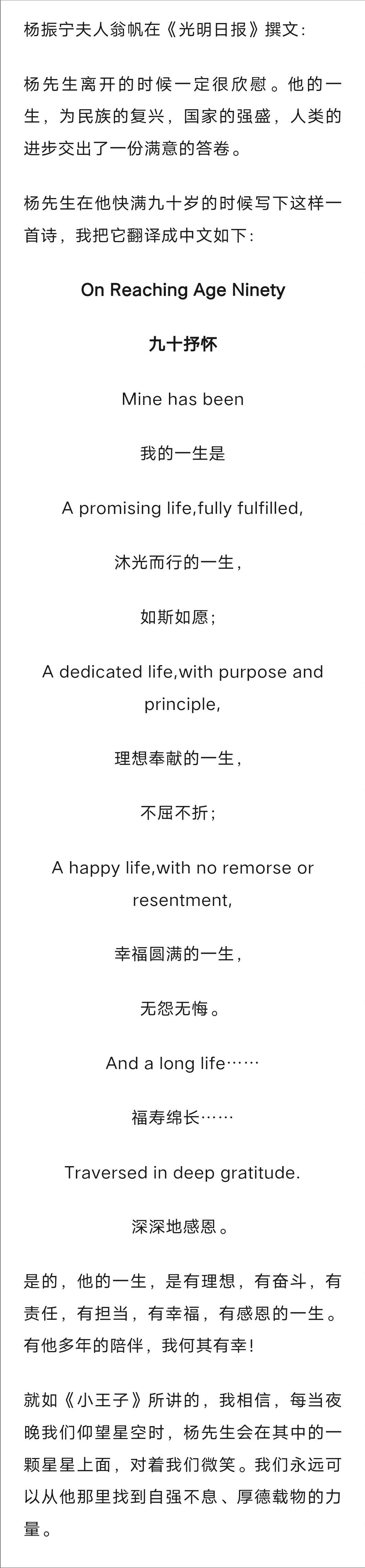 翁帆的这篇悼文,再一次向世人证明了,真爱无关年龄!虽简短却不失深意,不仅对杨先生的一生做了非常好的赞美,还情义满满,令人感叹~ 原来,终究是世人肤浅了!看她发表在《光明日报》中的撰文,虽只有短短数语,却既有温度也有深度,既有缅怀也有展望,既有回首也有感恩......特别是一句“交出了一份满意答卷”,对先生的崇拜之情溢满屏幕,实在太戳心!此刻,才终于明白两人为何能相携走过21年,虽然这一份跨越年龄的爱恋一直饱受非议,但这对追求灵魂相契,精神共鸣的老夫妻,却能一路情真意切的相伴而行,实属难能可贵,堪称传奇!对此,大家怎么看呢?