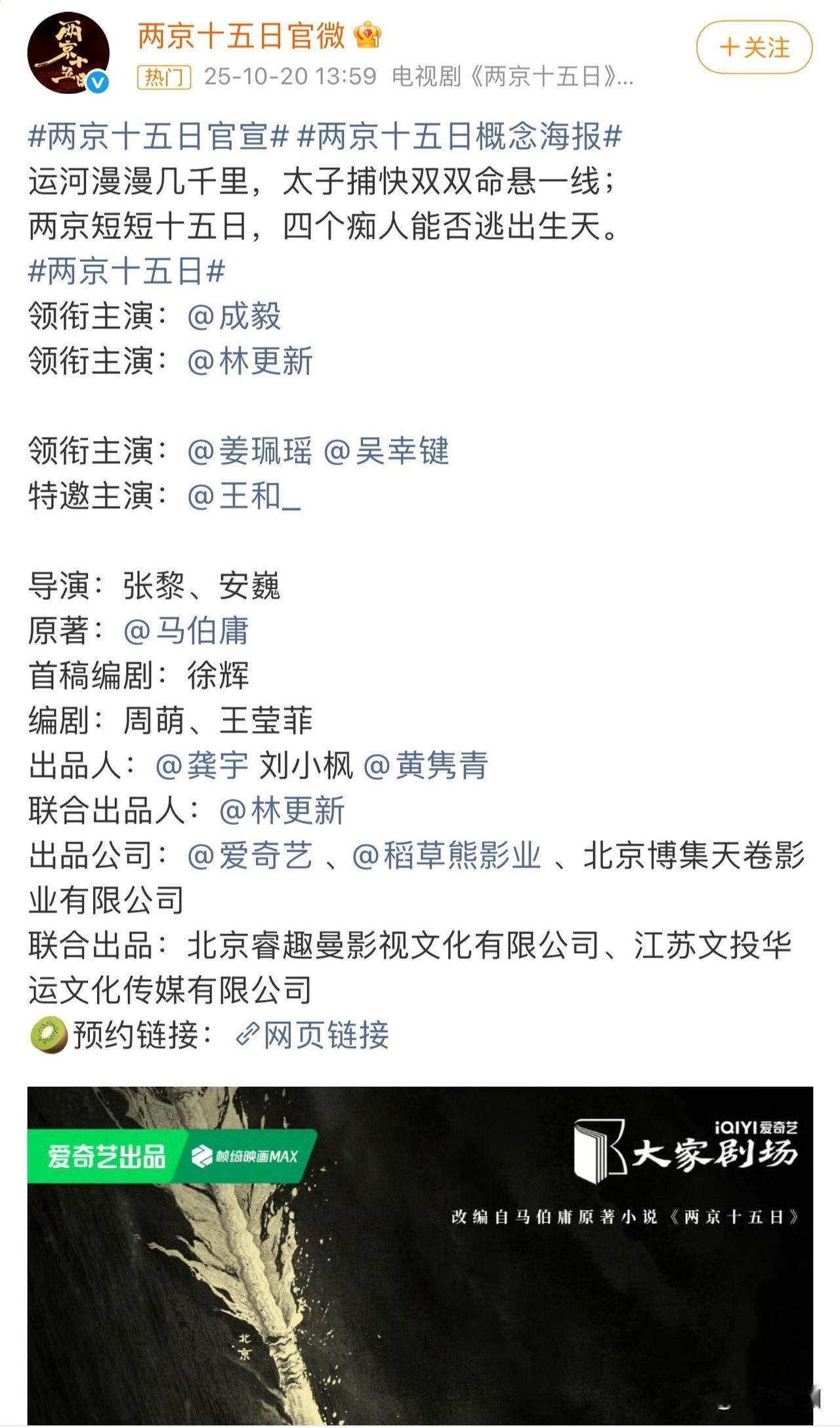 《两京十五日》,成毅和林更新出演双男主,这组合简直王炸! 成毅演技出色,《莲花楼》等爆款剧证明了他的扛剧能力,还有丰富的明制剧表演经验,演朱瞻基再合适不过。 林更新自带“叔圈苏感”,颜值帅气,他将出演朱瞻基的帮手吴定缘。 这两位的碰撞,一个演技加分,一个纯帅……花火肯定精彩……