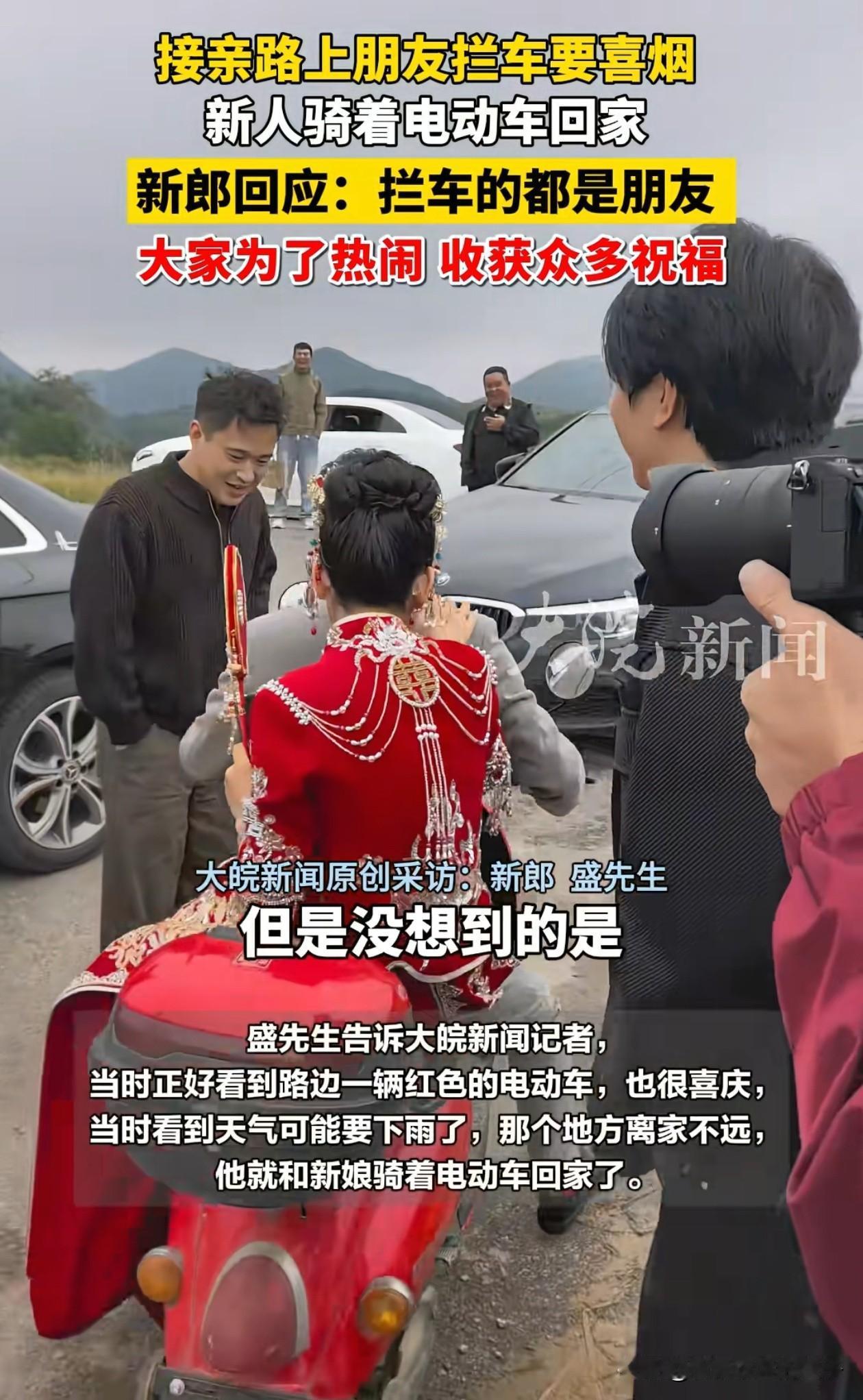 安徽,男子接亲路上被朋友拦下,让新郎每人发条烟,不然就不让路,一番哄闹过后,朋友仍不挪车,正巧这时邻居骑电动车路过,新郎机智的借来电动车把新娘搭走了,留下一群朋友傻眼了。 拦车的几人应该和新郎挺熟悉的,估计就是图个热闹好玩,看他们开的车都是奔驰宝马,也不像是缺钱的人。 新郎还和其中一人打趣,上次对方结婚他一包烟都没拿到,轮到他结婚了要一条烟太多了,担心后面烟不够用。 每个人一包烟就好,一条就过分了,新郎都主动说几台车给一条烟分,挺有诚意的,后面新郎明显有点生气了,这几人还不会看眼色。 一般硬中也要400元,挣钱不容易,有个形式就可以了,没必要搞得太尴尬了! 不过,新娘心态也挺好的,没有闹脾气,坐电瓶车还在笑,新郎值了,娶了个好老婆!