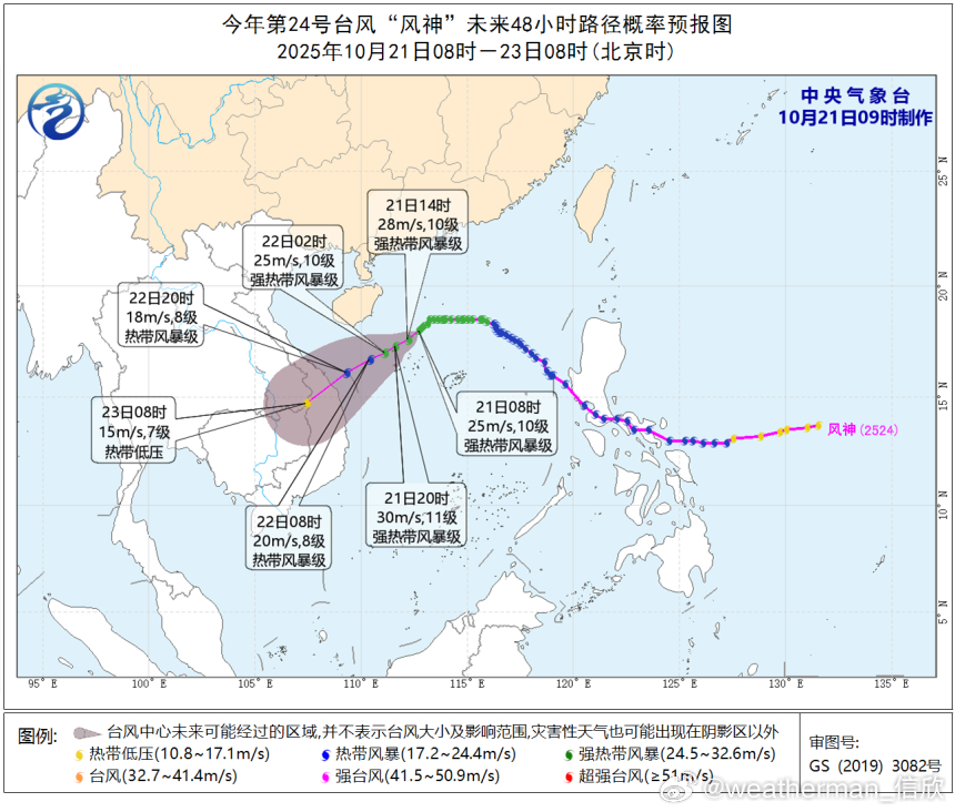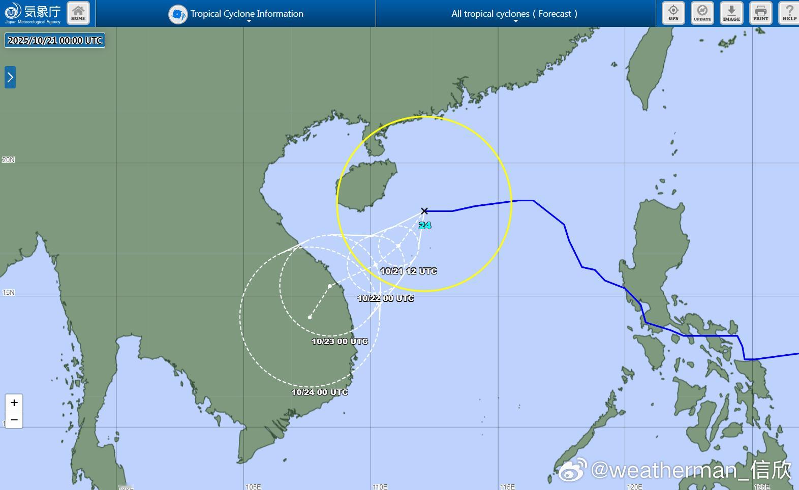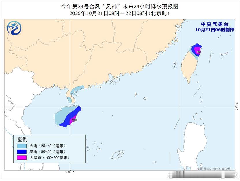 降水预报:21日08时至22日08时,广东西南部、海南岛、台湾岛北部等地有大到暴雨,海南岛东南部、台湾岛北部局地有大暴雨(100-200毫米)。