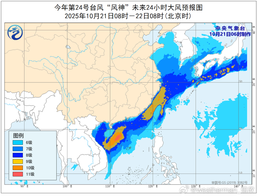 大风预报:21日08时至22日08时,台湾海峡、台湾以东洋面、巴士海峡、南海西部、南海东北部和中东部、东沙群岛、西沙群岛及中沙群岛附近海域、北部湾、琼州海峡、东海、黄海、渤海海峡以及山东半岛沿海、江苏沿海、上海沿海、长江口区、杭州湾、浙江沿海、台湾沿海、福建沿海、广东沿海、广西沿海、海南岛沿海将有6-8级大风,阵风9-10级,其中东海西南部、台湾海峡、台湾以东洋面、浙江南部沿海、福建沿海、南海西北部和中西部的部分海域或地区的风力有9-11级,阵风11-13级。