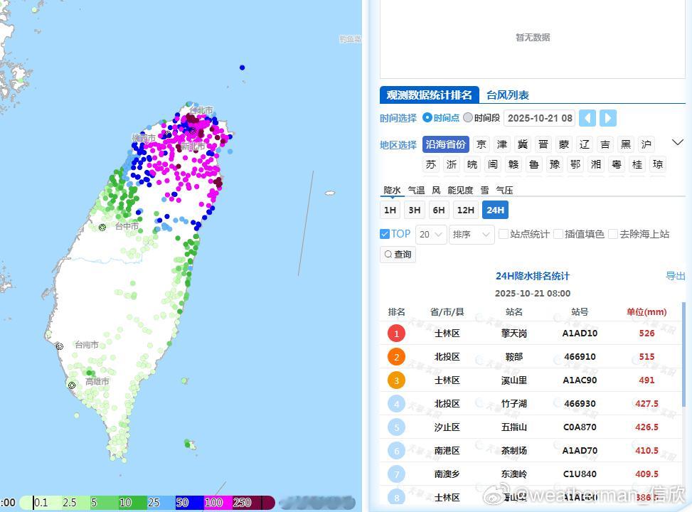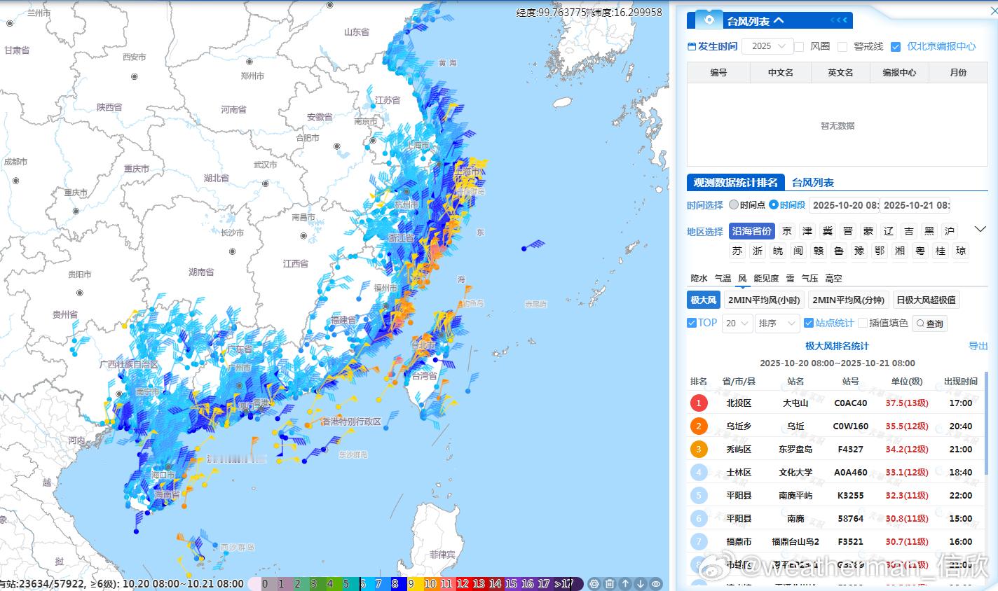 台风风神 今晨因为冷空气进入台风风神,强度没有发展起来,还是强热带风暴级别。另外在台湾东北侧目前还有个扰动97W。在台风风神、扰动、冷空气的共同作用下,昨天到今晨,浙江沿海、福建沿海、台湾部分站点阵风11-13级。台湾北部士林区的擎天岗、北投区鞍部,降水量超500毫米,出现特大暴雨。