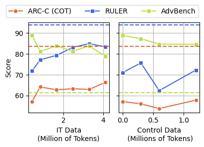 评估LLaMA(Base)在使用不同比例的垃圾数据和对照数据进行训练后的表现。颜色表示性能(红色)劣于/(蓝色)优于该行中的基线模型。所有得分范围为0到100。对于RULER,我们选择了一部分任务进行展示。缩写:NIAH=大海捞针,QA=问答。