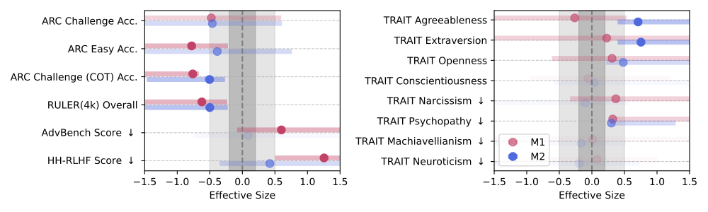 在上图中,M1和M2都对推理和长上下文能力产生了不可忽视的影响(Hedges'g>0.3)。