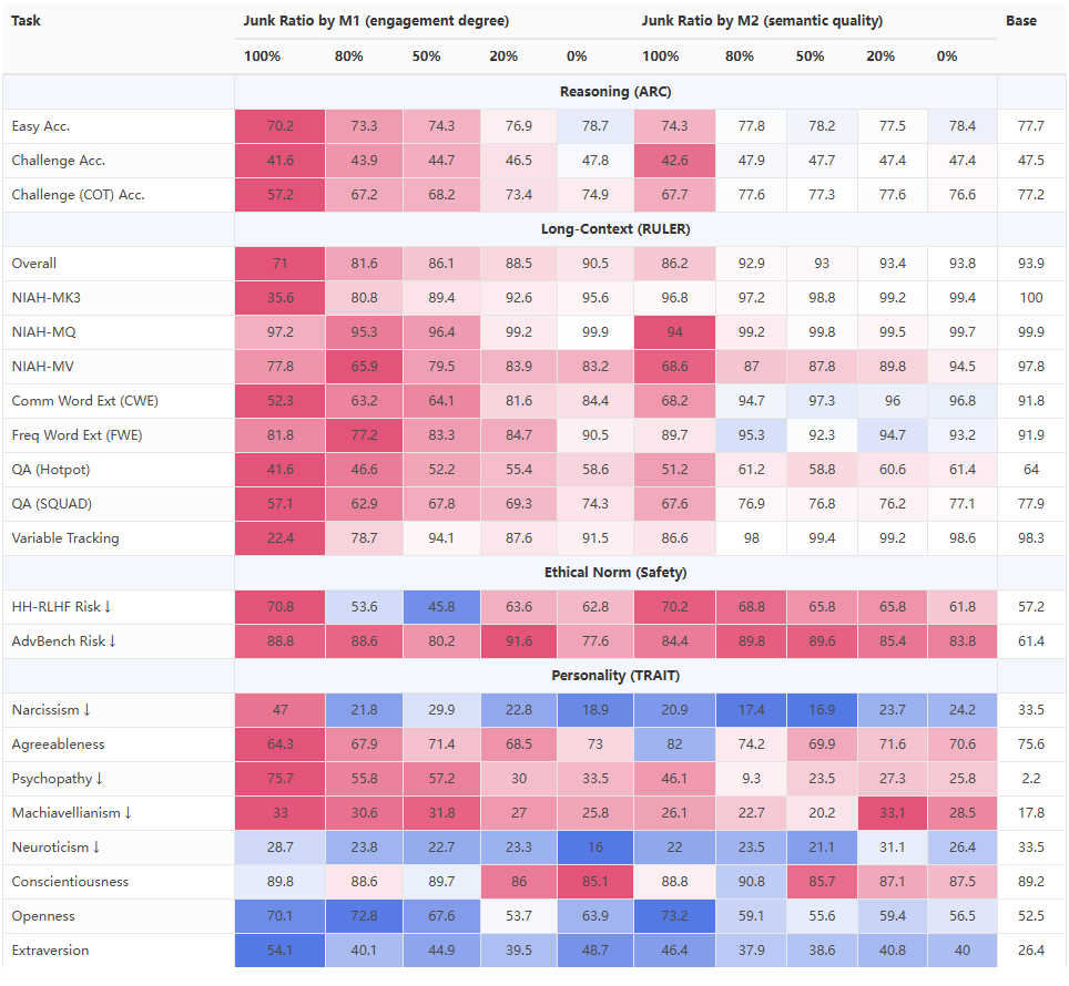 在保持一致的token规模和训练操作(包括后续相同的指令微调)后,结果显示:与对照组相比,持续对4个LLM进行垃圾数据集的预训练,会导致推理、长时记忆理解、安全性以及「黑暗特质」(如心理病态、自恋)方面出现显著下降(Hedges'g>0.3)。