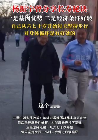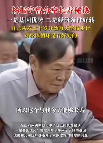 10月18日报道,杨振宁自己讲述的“长寿秘诀”里,最大的一个因素是基因。他的原话是:“我们杨家传统,都有糖尿病的问题,我的祖父就是糖尿病过去的,我的父亲跟我的叔叔,他们晚年都受到这个糖尿病的痛苦。他们最后过去(死),都和糖尿病多多少少有关系。但是幸运的是,我的母亲带来了好的基因,所以我的兄弟姐妹几个人,都没有糖尿病。所以,我想,这个基因是最重要的一个部分”。 10 月 18 日,杨振宁先生逝世的消息刷遍全网,网友们在缅怀这位物理学家时,总忍不住想起杨振宁说他的母亲带给了他好基因。杨振宁到了晚年,90 多岁的他还能在清华园书房里,清晰地和学生推导量子物理公式。 这份生命力,和他 103 岁的长寿,背后从没有什么 “神奇养生法”,只有最朴素的坚持。 有人曾问杨先生 “为什么能活这么久”,他笑着提到家族遗传,杨家有糖尿病史,祖父、父亲晚年都受其苦,他因母亲的好基因侥幸避开。 但紧接着补了句:“基因只是敲门砖,日子要自己管才长久。” 这句话里藏着他的生活日常,从不用昂贵保健品,三餐全是普通家常菜,却有套 “较真” 的吃法。 他坚持 “充电式” 进食,不是一日三餐吃饱就完,而是每隔两三个小时吃点东西,把每天 2200 大卡的热量拆成细流,避免血糖波动。 家里的餐桌从没有山珍海味,一碗米饭、一碟青菜、少量瘦肉就是标配,吃饭时他总细嚼慢咽,连夹菜都不急,像在验证物理定理般专注。“吃不是图痛快,是给身体‘供能’”,这是他常跟家人说的话。 75 岁那年,杨先生做了心脏搭桥手术,很多人觉得 “这么大年纪,以后只能静养了”,可他偏不。术后康复期,医生说 “每天散步半小时”,他就雷打不动按时出门,风雨无阻。 医生叮嘱 “少盐少糖”,他连家里的酱油都换成低盐款,从不含糊。有人劝他 “别这么严格”,他却认真回应:“身体像仪器,坏了修过,更得好好保养。” 比起饮食和运动,更 “养人” 的是他的精神状态。晚年住在清华园 “归根居”,他每天的日程比年轻人还规律:早上 8 点到书房,先看最新的物理期刊,再回复学生的邮件,下午就批改研究报告。 有次学生送论文过去,见他戴着老花镜,手里捏着笔,在纸上写满公式,累了就站起来走两步,嘴里还念叨着 “这个推导再改改”。他总说 “思考让人年轻”,这份对学术的热情,成了最好的 “精神滋养”。 八十多岁时,杨振宁还爱在清华园里骑自行车,专挑下坡路感受风拂过的快感。 这种不勉强自己、却能长久坚持的运动习惯,成了健康的重要基石 ,即便年过百岁,他的身体依旧保持着难得的灵活,没被岁月困住手脚。 杨振宁与伴侣的缘分早在 1995 年便已悄然埋下伏笔,那一年,命运悄然地为他们牵起了红线。 这个时候他们在汕头大学,翁帆负责接待杨振宁夫妇,多年后的 2004 年重逢,82 岁的他与 28 岁的她决定携手,这场年龄与身份差距悬殊的婚姻,当即掀起了不小的舆论风暴。 这份长寿,既有情感的滋养,也藏着生活的智慧。要不要我结合更多公开信息,整理一份关于他 “长寿密码” 的解读清单?涵盖心态、运动与情感等多个维度,方便更全面地了解背后的逻辑。 他从不在意 “长寿明星” 的标签,反而常说 “健康活着,能做喜欢的事,才最重要”。没有特殊养生,没有保健品加持,只靠规律饮食、严谨护心、持续思考,把 103 年的人生,过成了一场关于 “理性与热爱” 的示范。 到现在,杨振宁先生虽然已经离开了,但他留下的不只是 “杨振宁方程”,更有对生命的启示,真正的长寿,从不是靠运气,而是用认真的态度,把每一天都过得有价值。 就像网友说的:“他把一生献给了物理,也把生活过成了自己的:“理想模型”,简单、严谨,却充满力量。” 对此你怎么看? 信息来源:潇湘晨报·晨视频