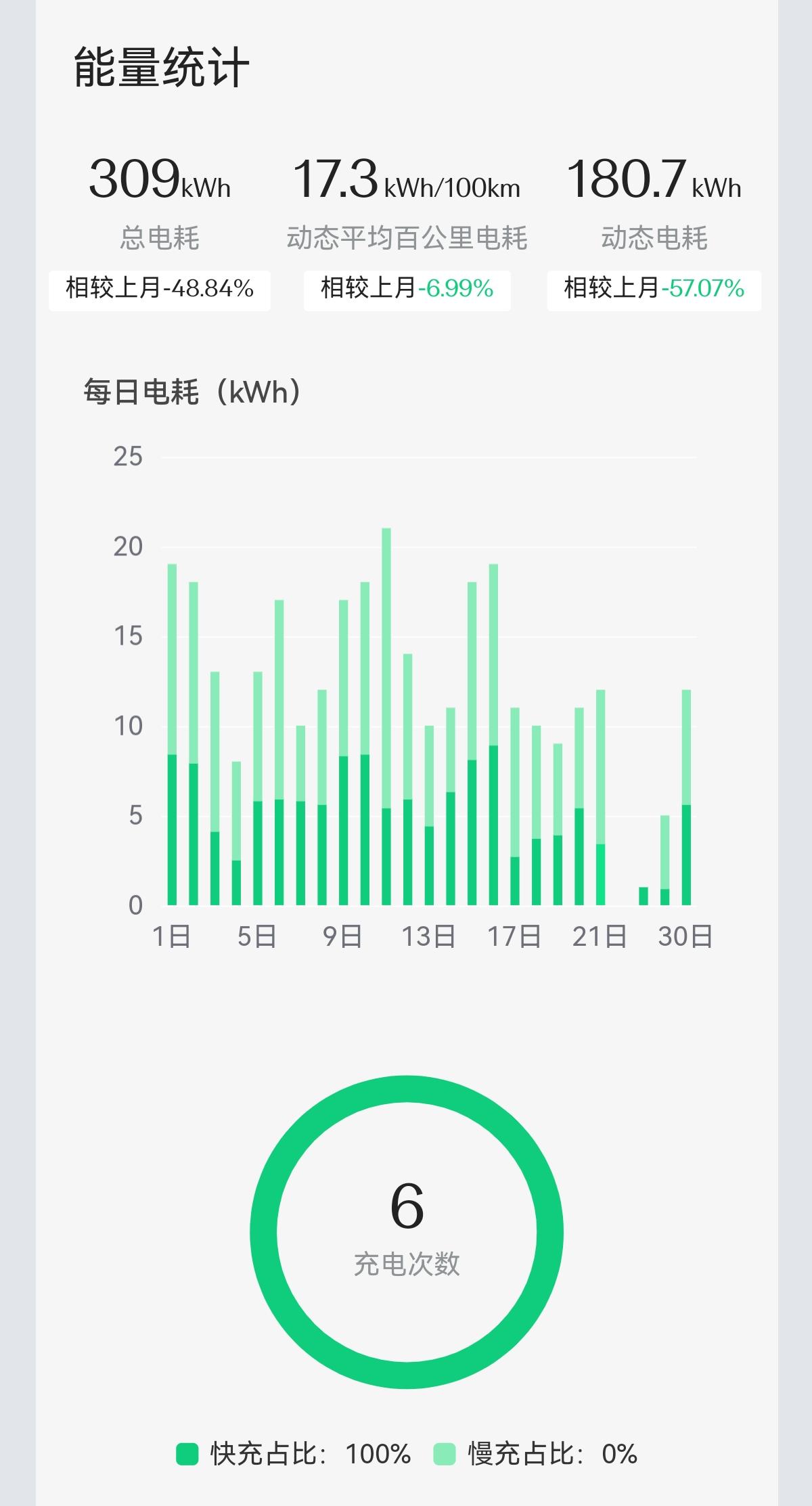 9月份我驾驶我的爱车七茶行驶了1045公里。不到8月份的一半。是因为8月份我高速就行驶了1000公里。而9月份我有7天出差,没有开车。 从电耗来看,9月份的平均能耗是百公里17.3度电。而8月份的平均能耗是百公里18.6度电。可见高速行驶对于电车的能耗消耗还是非常显著的。经过多次计算我在高速以120公里的限速行驶平均能耗是19.5左右。而日常的城区驾驶能耗是17-17.5左右。理论上满电可以行驶550公里以上。 但如果计算每月产生的电费就需要通过总能耗来计算。我9月份的总能耗是309度。平均的电费在5毛左右。309×0.5=154.5元。而8月份的总能耗是604度,因为在平价时间充了两次电,所以均价达到了6毛1度,604×0.6=362.4 元,这个费用是我开电车9个月以来的最高电费。但即便如此,和我之前的油车一个月1600元起步的油费相比,还是只占个零头。 预计我10月份的能耗还会很低因为国庆期间并没有出远门再加上10月份要出差10天,所以驾车的里程会和9月份相当。到时候再和车友们分享。【来自懂车帝车友圈】