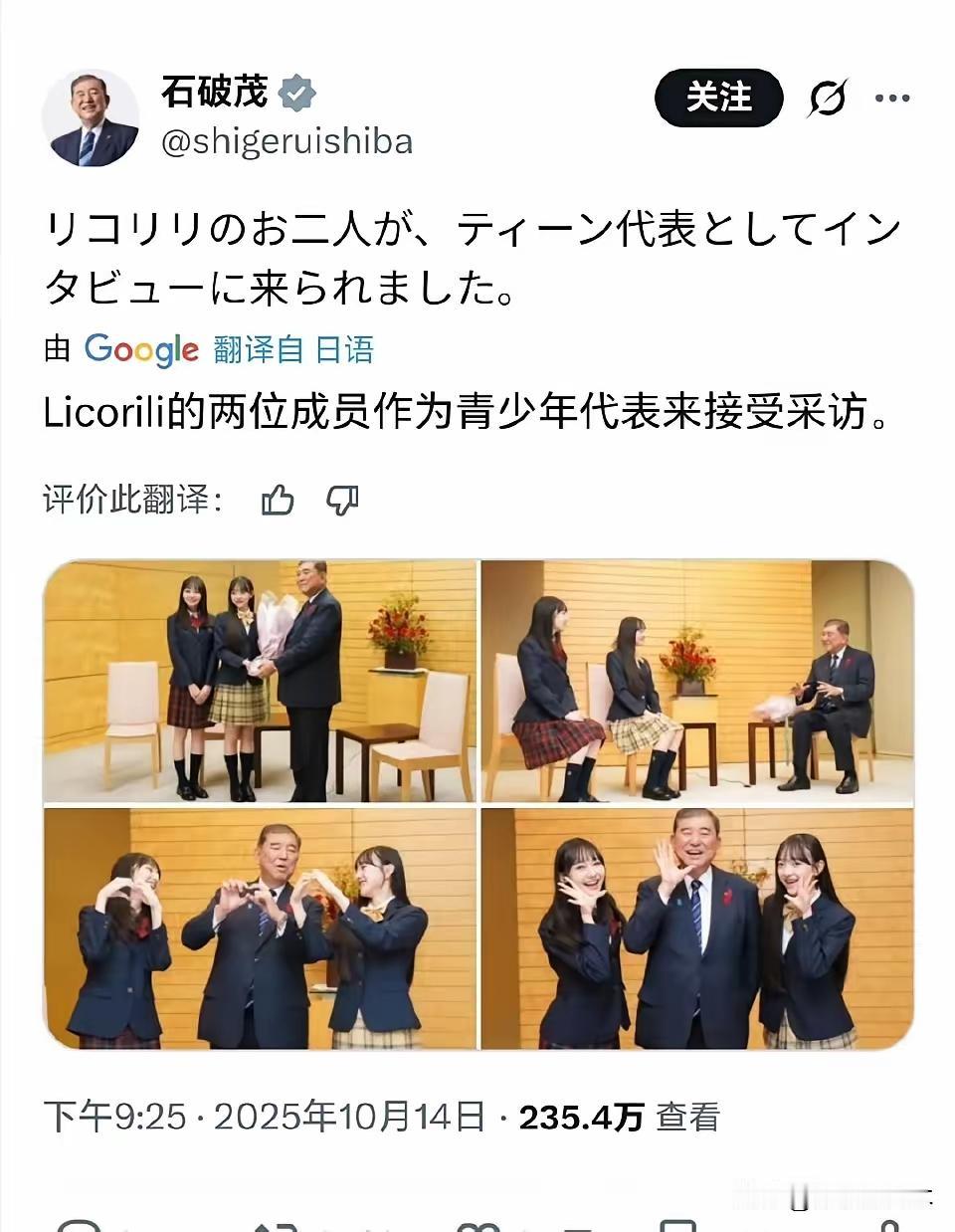 石破老狐狸还是真性情! 近日石破茂会见了当红日本少女偶像团体Licorili的两位成员,还发文炫耀。接见过程中,石破茂精神抖擞,老脸笑得跟朵菊花似的。 这跟他当选首相以及日常工作中萎靡不振、要死不死的样子简直判若两人。老家伙一看见青春美少女,腰不酸了、背不痛了、眼睛也睁开了,迸发了第二春啊!