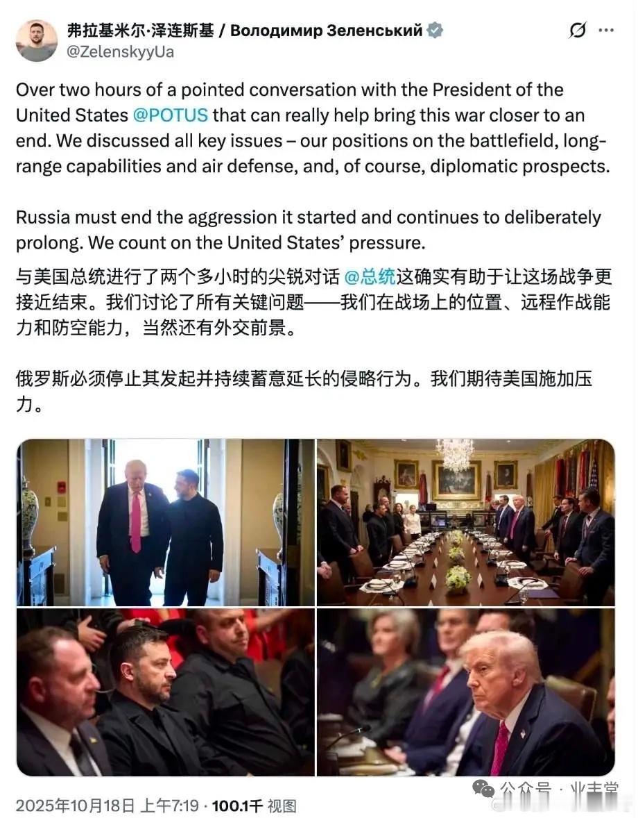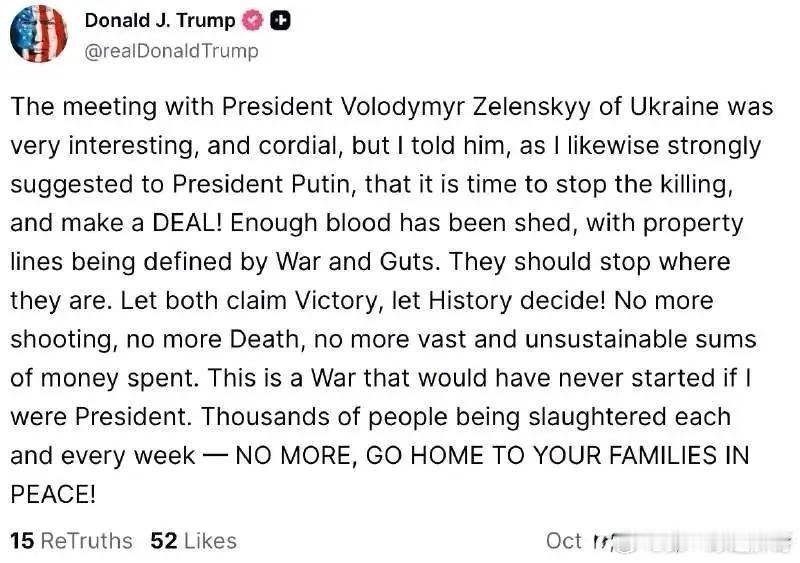 10月17日,特朗普在与泽连斯基的会谈结束后发表评论。全文如下:“与乌克兰总统弗拉基米尔·泽连斯基的会面非常有趣且友好,但我对他说——就像我曾强烈建议普京总统那样——是时候停止杀戮,达成协议了!别再流血了,不能让领土边界通过战争和所谓‘勇气’来决定。他们应当在当前所在的位置停火。让双方都宣称自己取得了胜利,让历史来评判吧!别再开火,别再有人死亡,别再投入巨额且难以承受的资金。如果我当时是总统,这场战争根本就不会爆发。每周都有数千人被杀——够了,回到家人身边,过上和平的生活吧!”